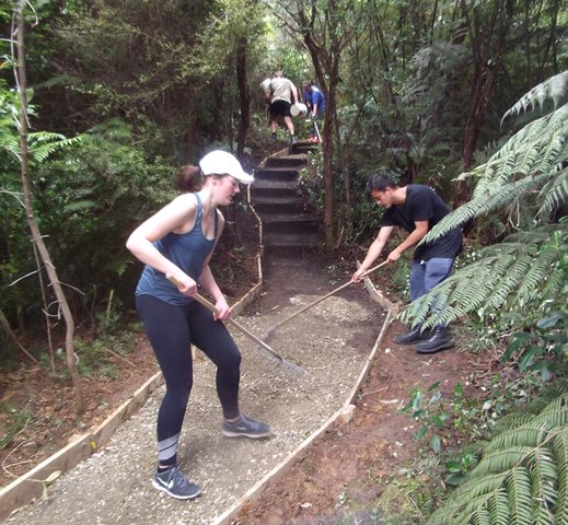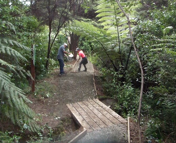 The groups accomplished an amazing amount of work before breaking for lunch. Some people needed to leave after lunch, but another group arrived after lunch and we continued working. The last task to finish off the refurbished track was to put down a layer of gravel so that the track is easy to walk on and not slippery in wet weather.