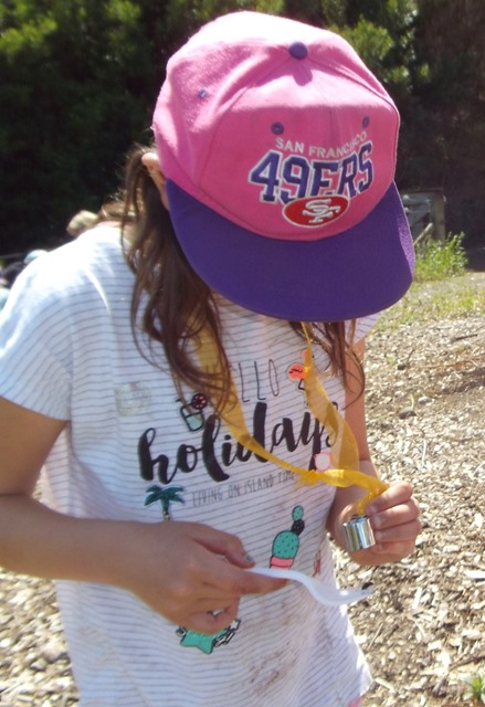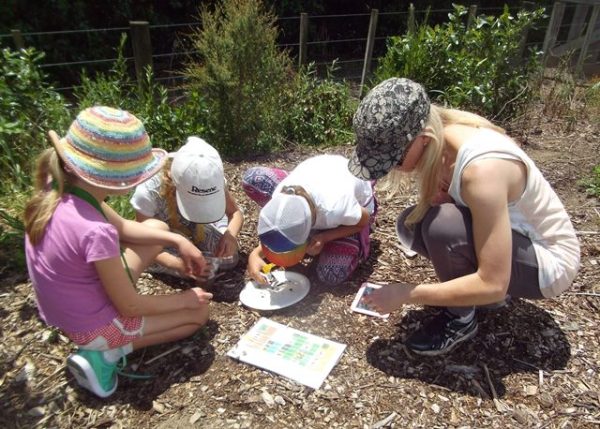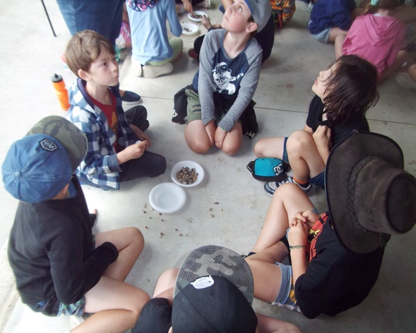 The students then moved out to the orchard to do some study of insects and invertebrates. We had previously placed pitfall traps in the orchard so that the students would have some specimens to study. Mahrukh explained how to use the traps and the students broke into groups. Assisted by an adult, they examined the creatures they found in the traps and used magnifying glasses and mirrors so that they could study the creatures from all angles. Using interpretive charts, they identified as many of the specimens as they could.
