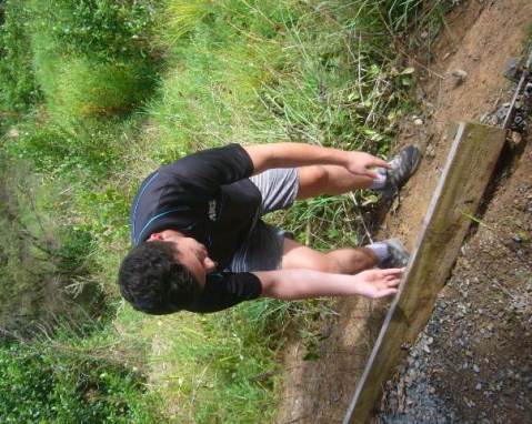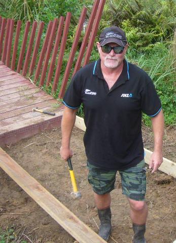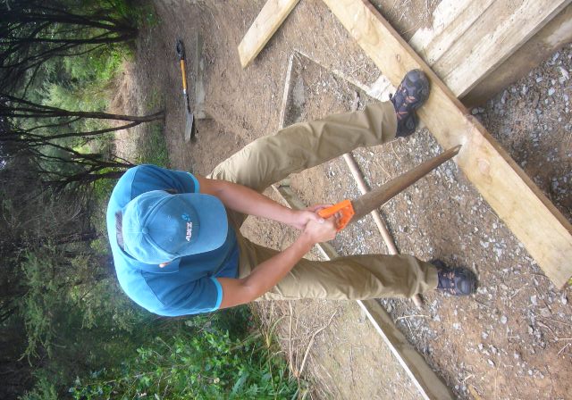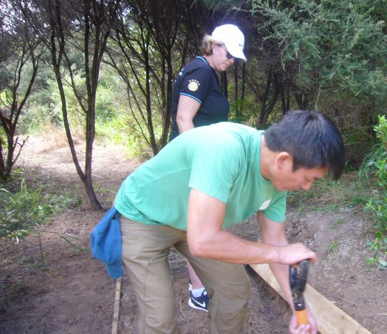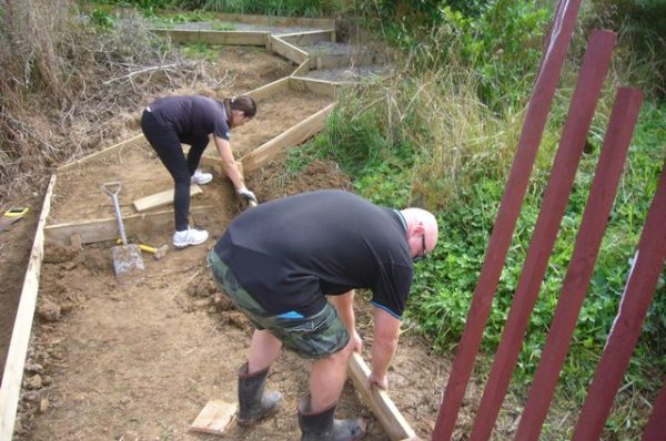 One team worked on extending out the existing retaining walls to a flat section of the track. This involved digging out channels for the retaining boards, cutting the boards to size and nailing them in place.