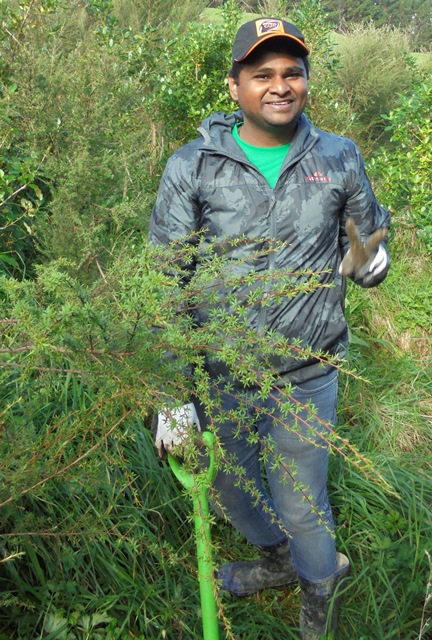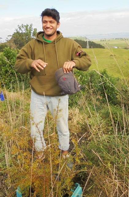 Today’s plan was to do infill planting of long-lived native trees (kahikatea, pukatea, kohekohe and totara) in an area near the top of the property which also has an extensive wetland . The area had been initially planted in 2015 and the pioneer trees have grown up enough to create a good environment for the bigger trees.
