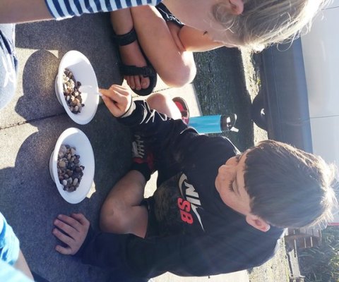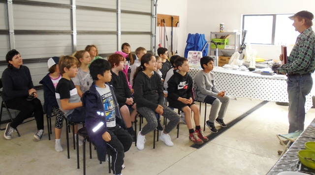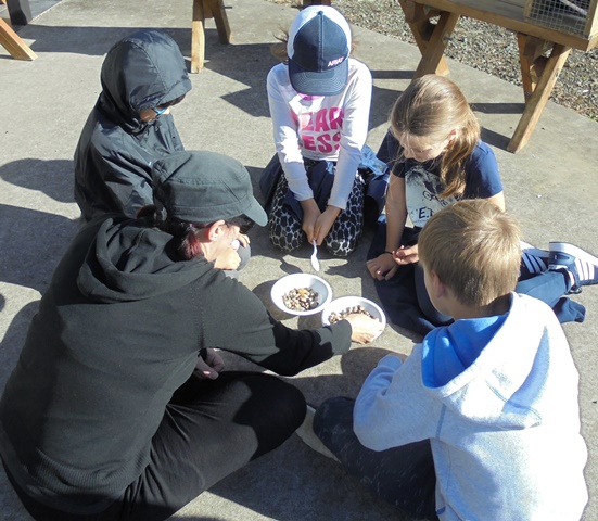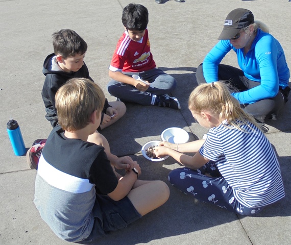 The students broke into small groups and each group was assisted by a parent or teacher. Each group had a bowl full of small stones and an empty bowl, a fork, a teaspoon and a tablespoon. The students were told that they were to take turns moving the stones from one bowl to the other, the first person was to use only their little fingers, the second the fork, the third the teaspoon, the fourth the tablespoon and the last person could scoop up stones with their whole hand.