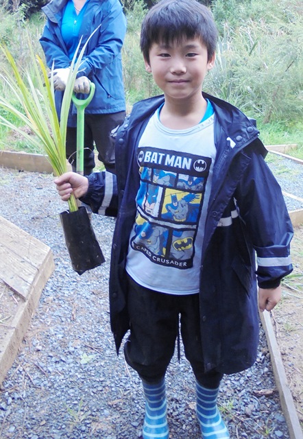 We took a short walk to the area where the stream flows into the wetlands. There the students planted cabbage trees, manuka and kahikatea trees. Thomas showed the students the trees they would be planting and explained where they should be planted to ensure they grow well.
