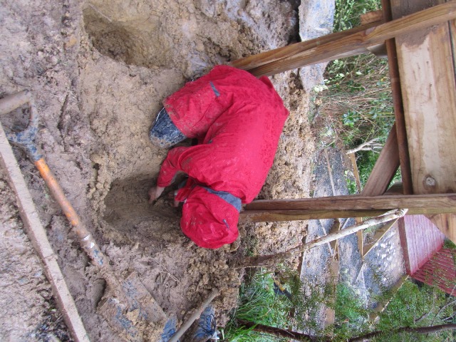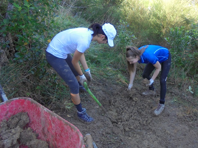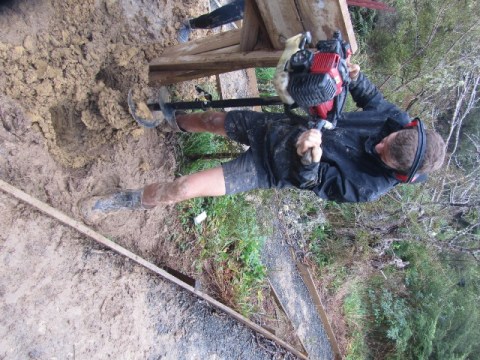 The first was fixing a washout on a long section of track. The retaining boards and pegging supporting the track had collapsed and there was the threat of further erosion. With Andy’s supervision, the team dug out the area, replaced and reinforced the retaining boards and generally straightened and improved the track.