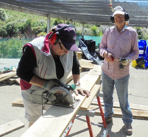 Once the frames were in place and the line of the boardwalk had been determined, we could figure out how many top boards we’d need. Fiona helped Thomas cut the boards to size.