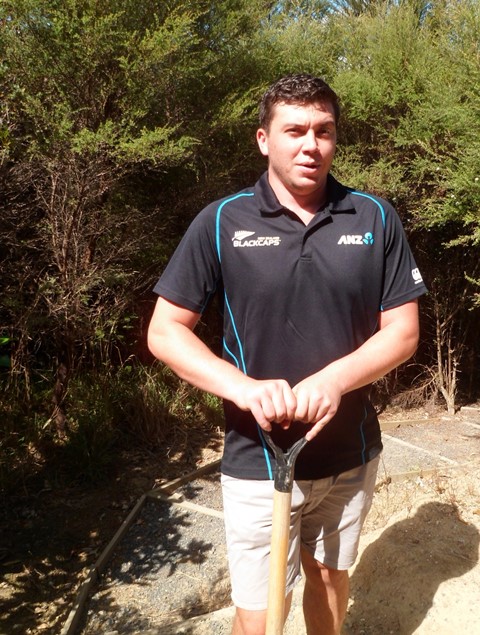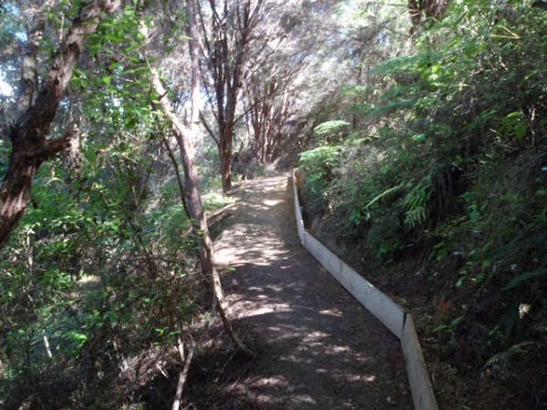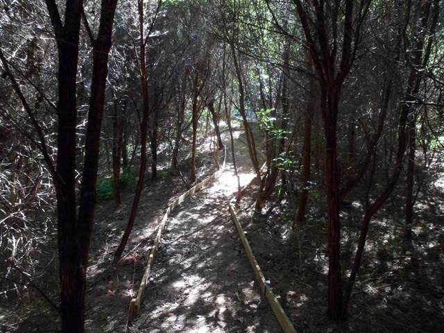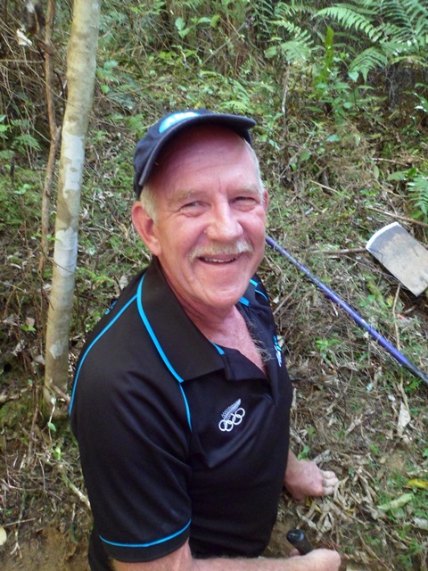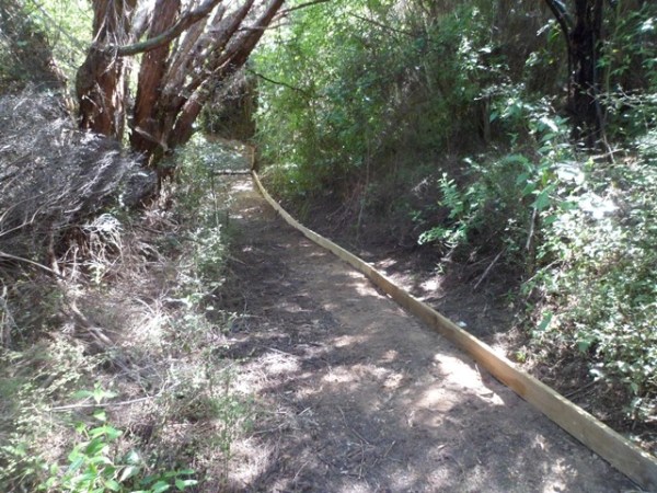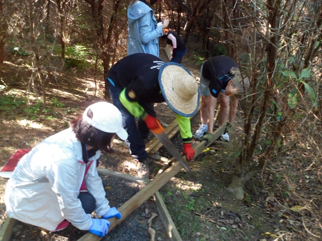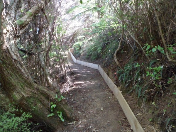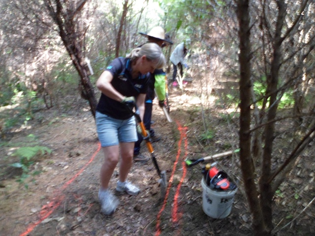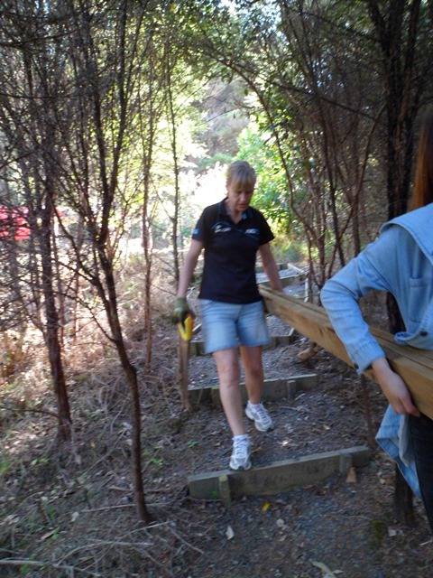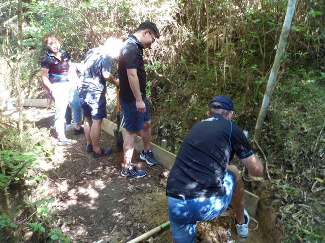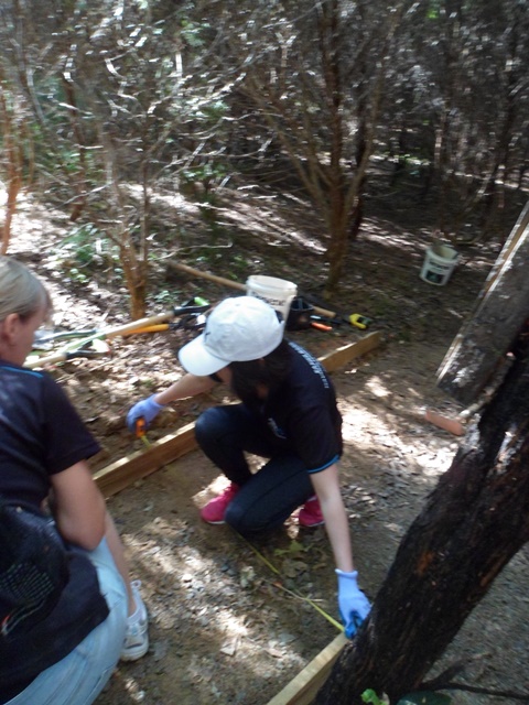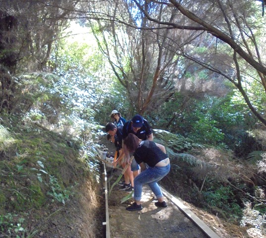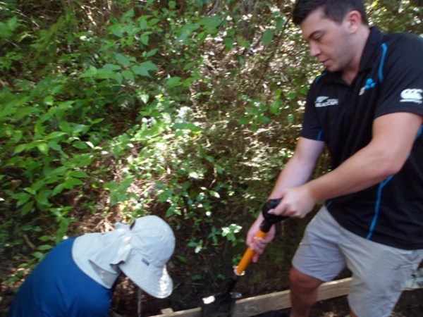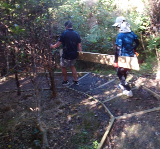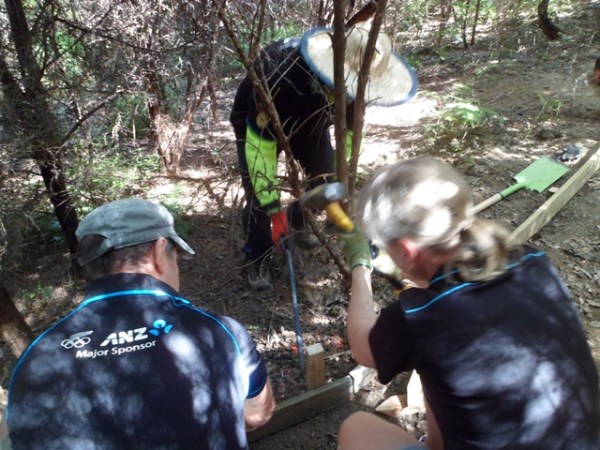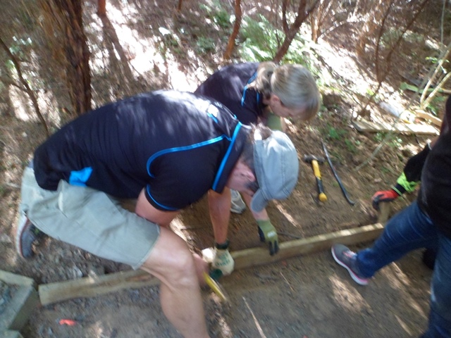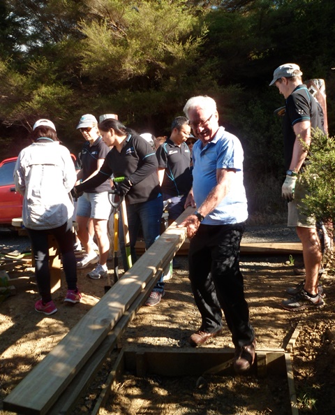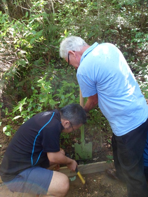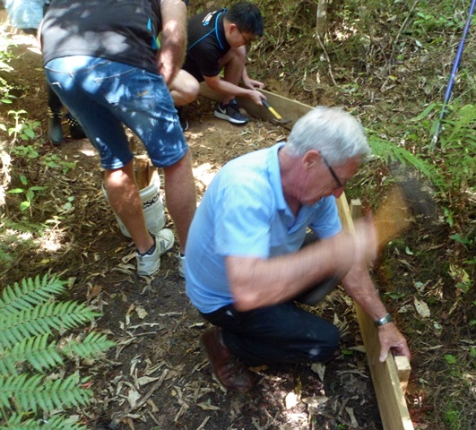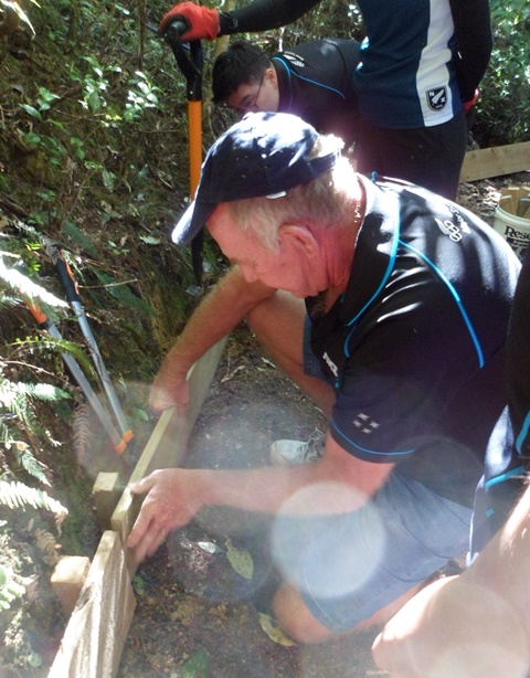 Alan’s team went to the far end of the track to continue to extend a retaining wall along a steeply benched section of track. The first task was to install an extra board on an existing wall.