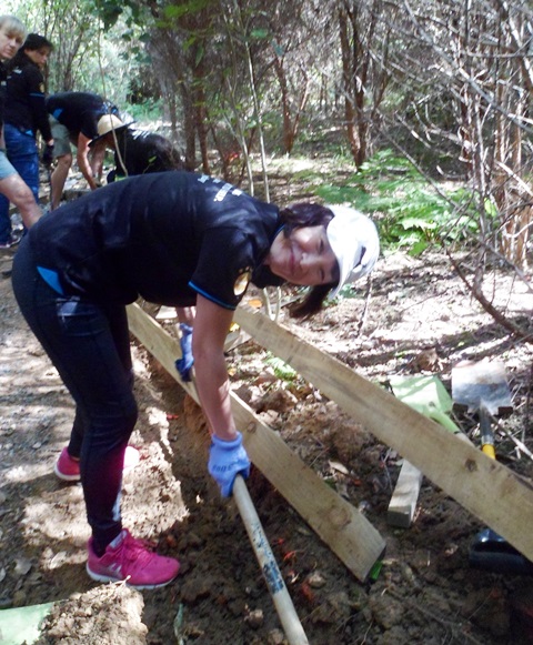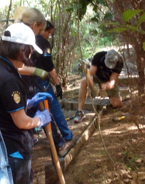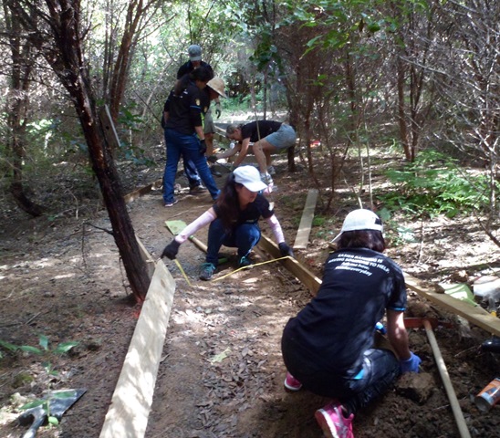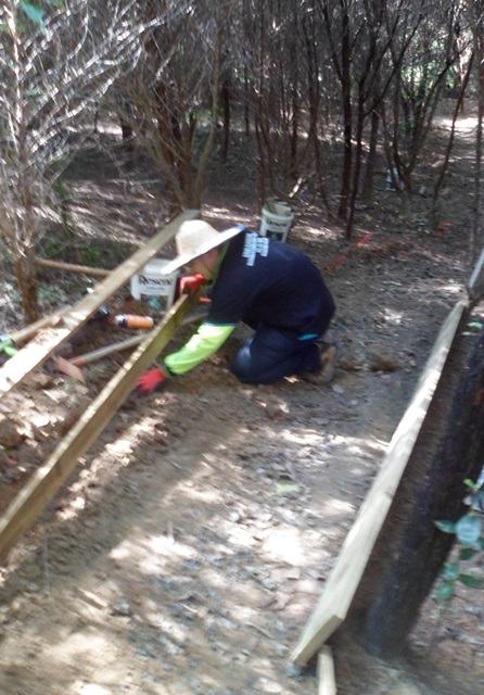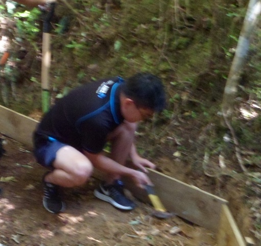 The plan for the day was to continue to work installing side boards and retaining walls on a long section of track. We broke the group into two teams. One group worked with Alan on one end of the track and the other team worked with Thomas near the other end.