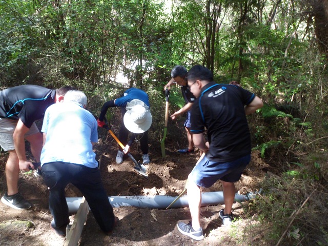 As the team moved down the track, the found an area where water had flowed across the track during heavy rain. They felt that it was only going to get worse and the best solution would be a drain pipe under the track to carry the water. We brought up a pipe and in no time, they dug a channel across the track and a culvert pit and buried the pipe.