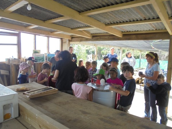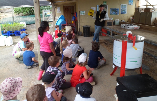 We’d like to thank beekeeper, Richard from Waitoki Apiaries, who brought over empty bee hives and combs, some bees wax and the honey extractor, where the combs are spun to remove the honey, so we were able to show these to the students.