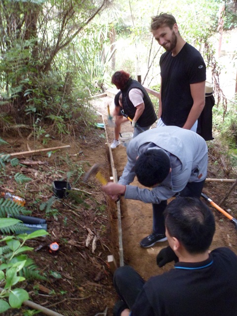 The team in the middle of the track first worked on installing retaining boards along a curved section of track. The first task was to dig out and level the area.
