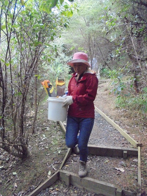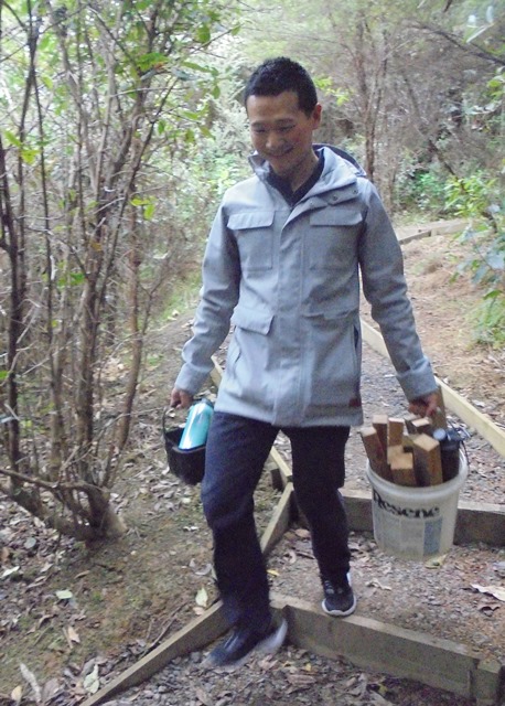 In the meantime, the other team was working up from the end of the track. Their first task was to reinstall some steps which were out of alignment. They then installed retaining boards along the steps and up the track.