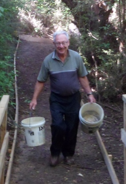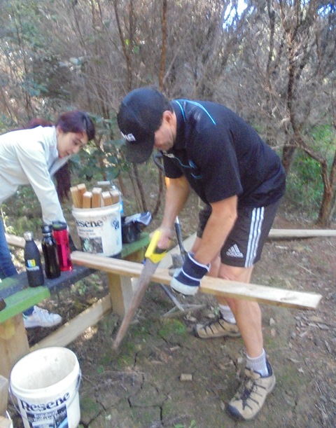 When they completed the retaining walls, they moved down the track to build some railings on a small bridge. They planned the work and brought down the timber they would need.