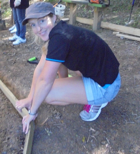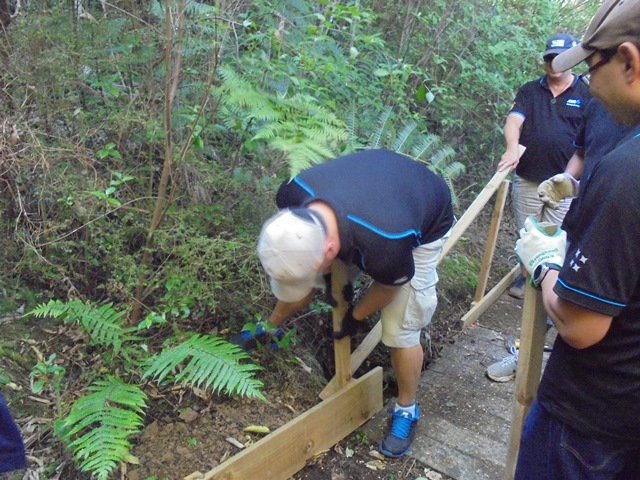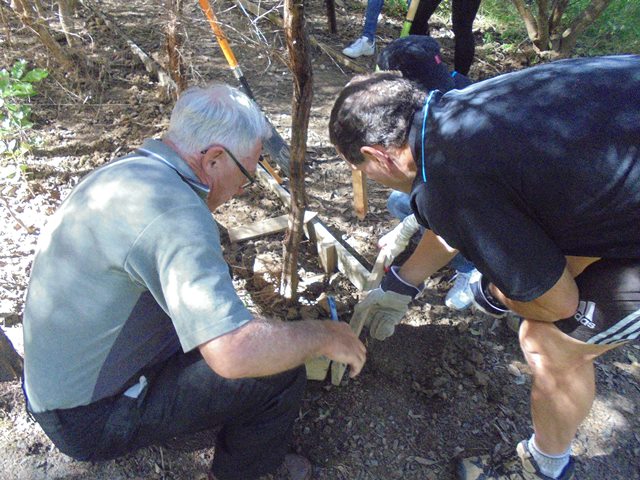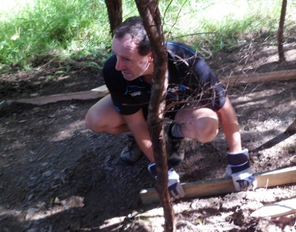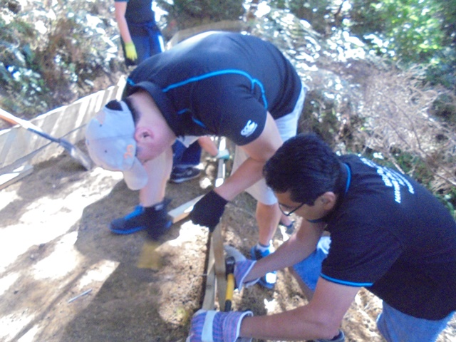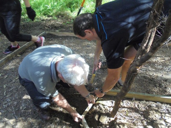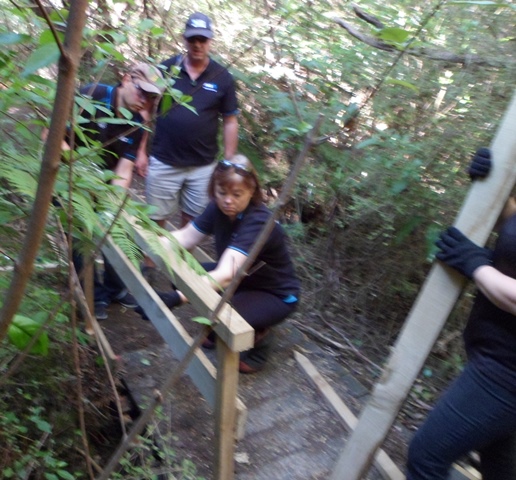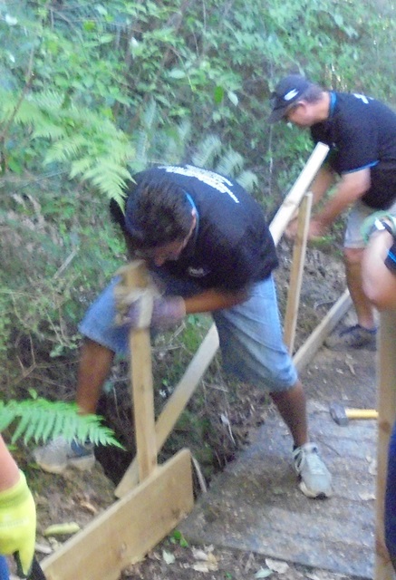 We broke into two team – one team worked with Alan to install side retaining boards near the top of the track and the other team worked with Thomas to retain a long section of track where there is a steep drop off and to install railings on a small bridge.
