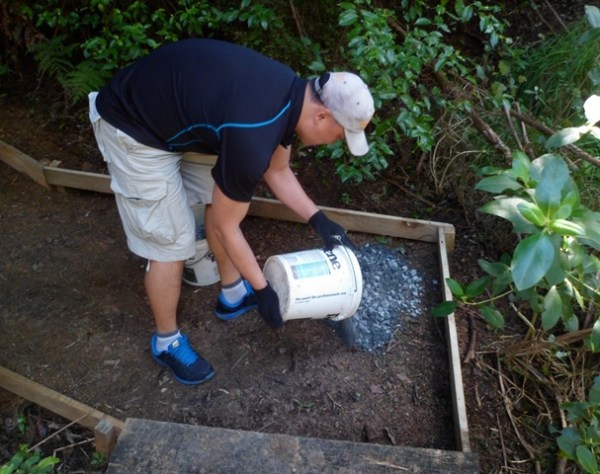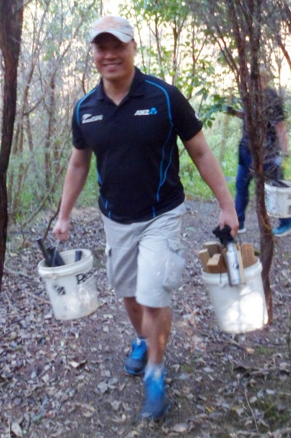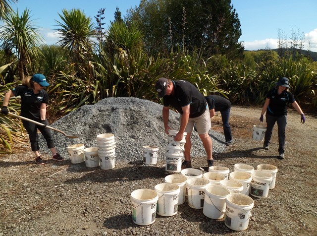 Thanks to the hard work of this team and many other ANZ teams, we have now almost finished the work on this track. The last big job is to spread a layer of gravel on the track. A lot of the track sections are exposed clay which can be very slippery and messy when wet. To make the track safe for all weather use, we put down a layer of gravel to provide traction. The only way to get gravel down to the end of the track is to carry it down, one bucket at a time.