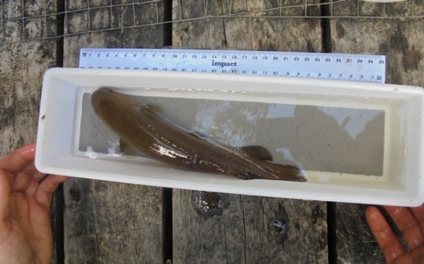 The eel was in no mood to stick around to be studied and vanished as soon as Kevin and Stephanie got it out of the net.