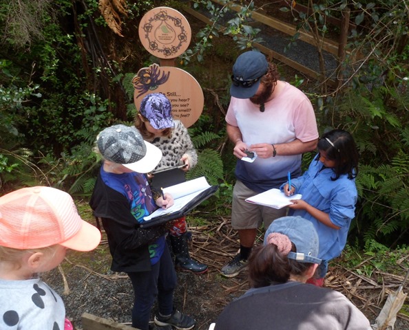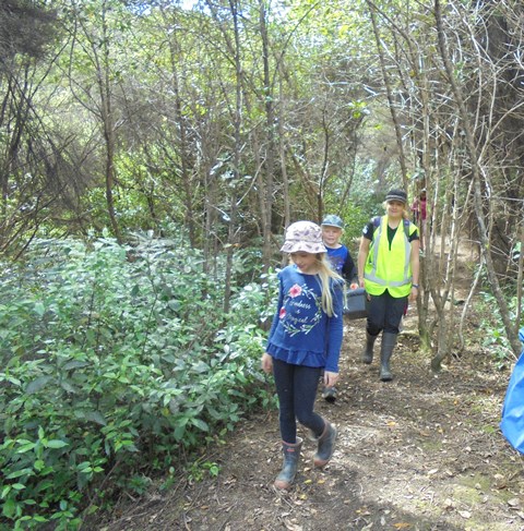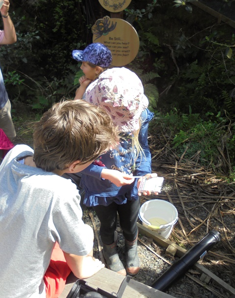 In April this year, all the students attending Ahuroa School came out to CUE Haven for a day of outdoor learning. The students have been studying water quality at the stream near their school and today, teacher Kevin Sutherland brought a small group of his students to explore the stream at CUE Haven so they could to do more intensive study on water quality and aquatic animals and compare the health of different waterways.
