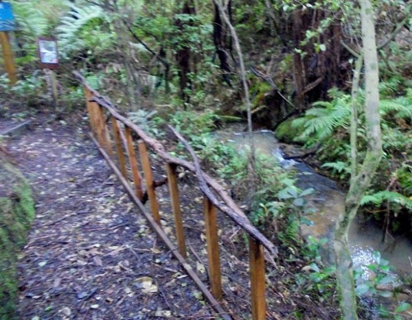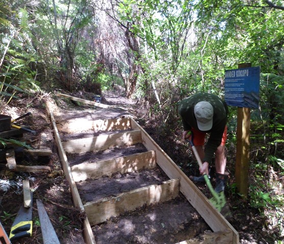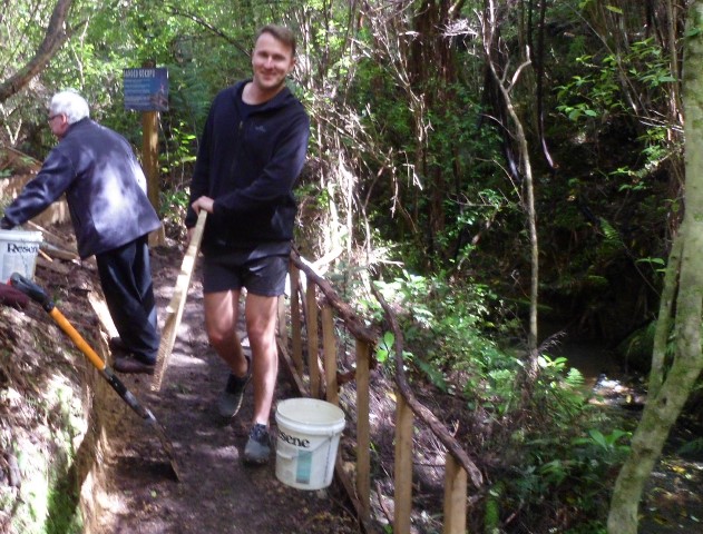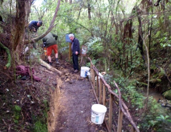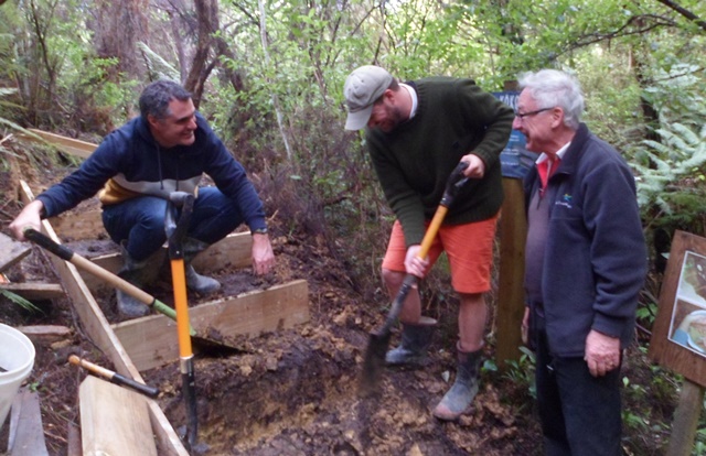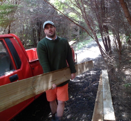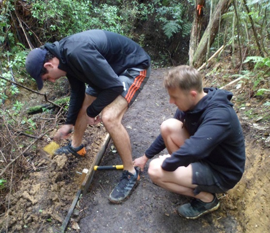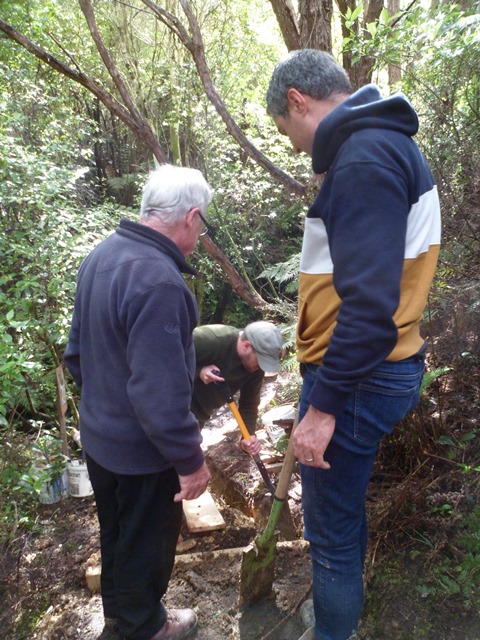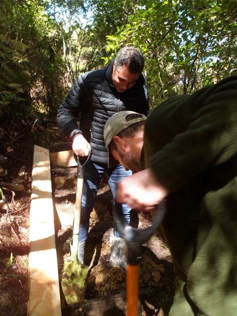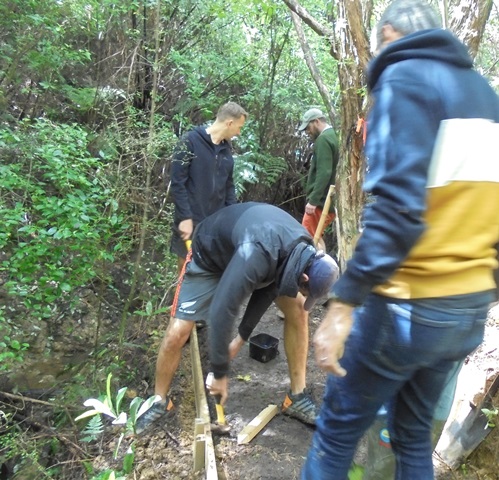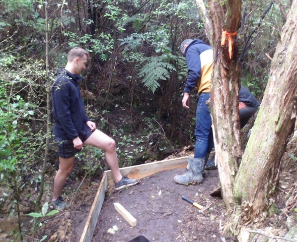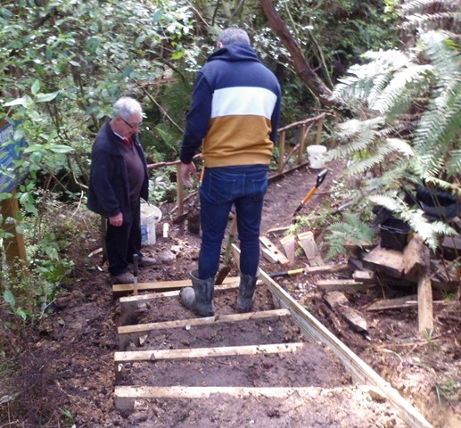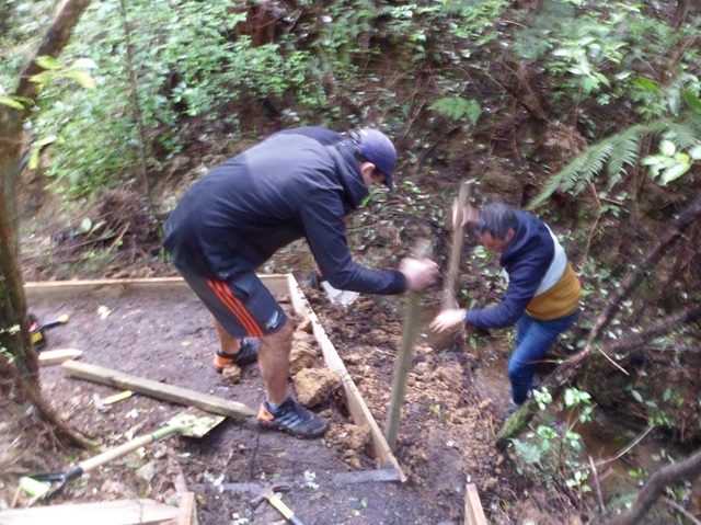 They then moved on to the next task. The edge of the track along the stream had eroded a bit and they installed a side retaining board to improve the track appearance and safety.