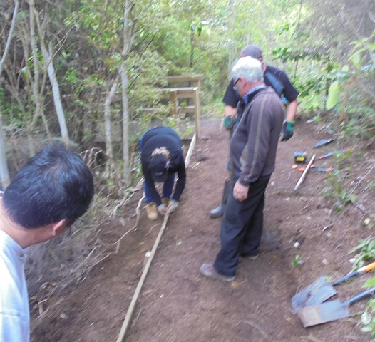 The third team worked on clearing up a section of track between a bridge and some steps. The track runs alongside the stream and we wanted to install a side board to make the edge of the track clear and to prevent erosion into the stream.