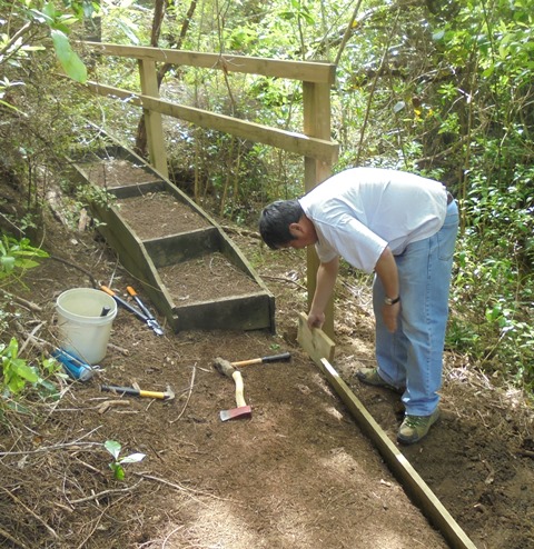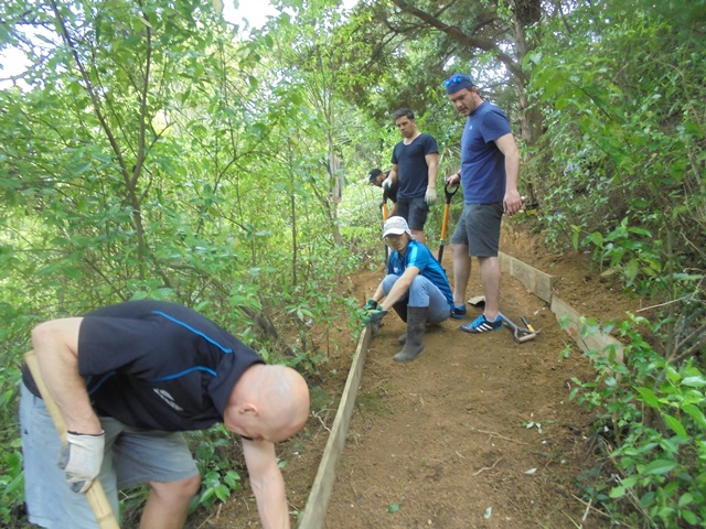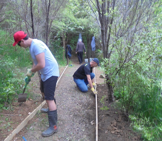 The third team worked on clearing up a section of track between a bridge and some steps. The track runs alongside the stream and we wanted to install a side board to make the edge of the track clear and to prevent erosion into the stream.