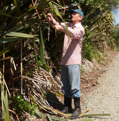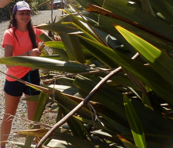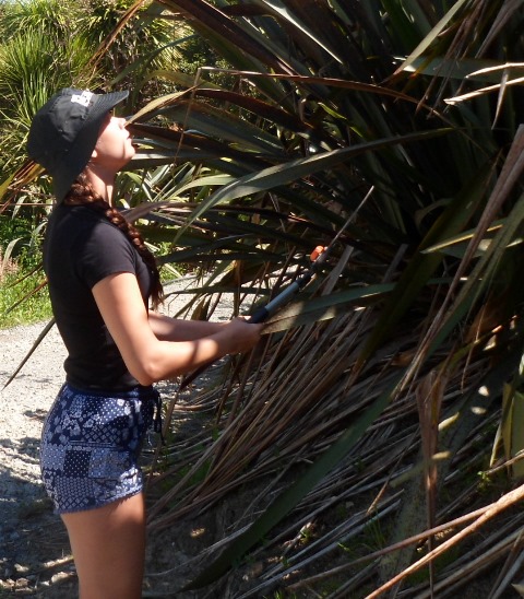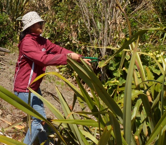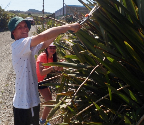 We then broke the group into two teams. Adrienne led one team and started at the gate, trimming the flaxes that were growing out over the road.