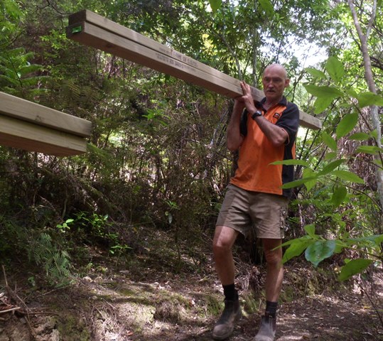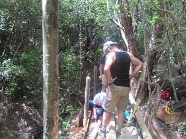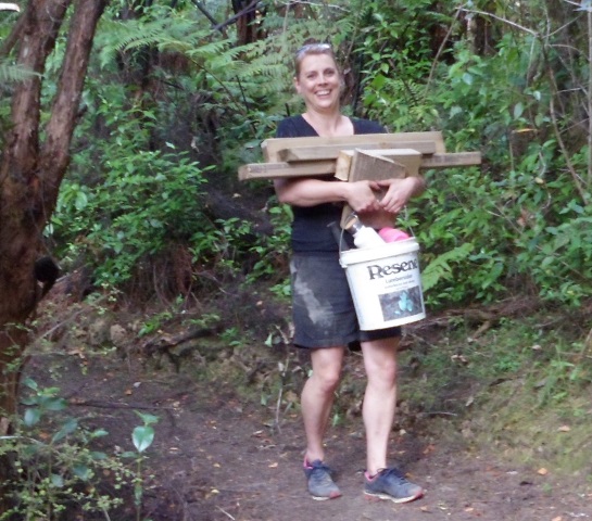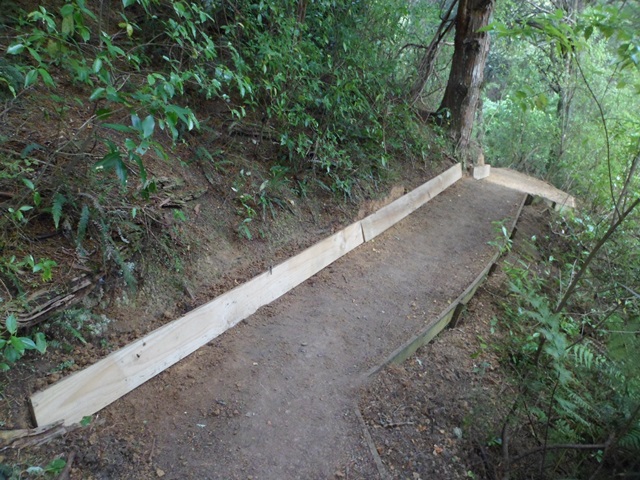 The walking track transitions from restored native vegetation to the stream gully where there is more established bush. The transition section of track of about two metres, has always been quite steep and the task was to install some steps to make it easier for visitors.
