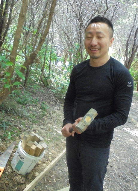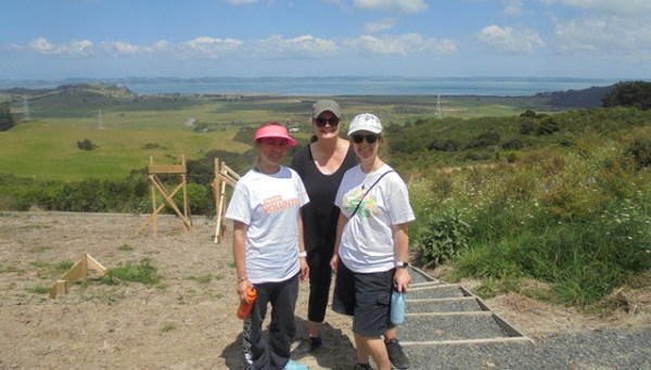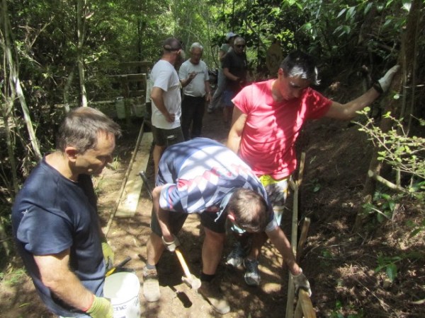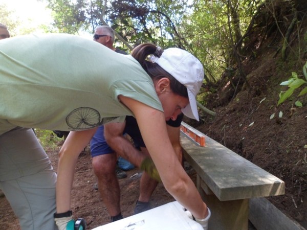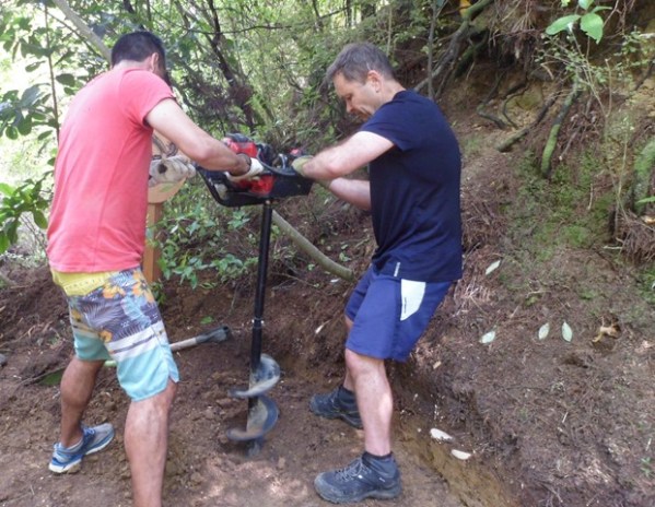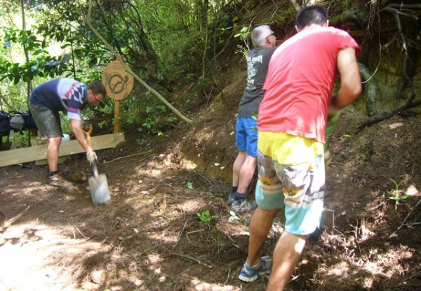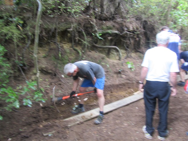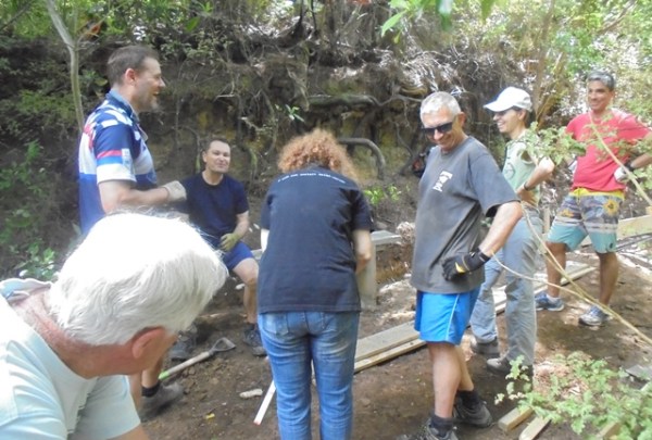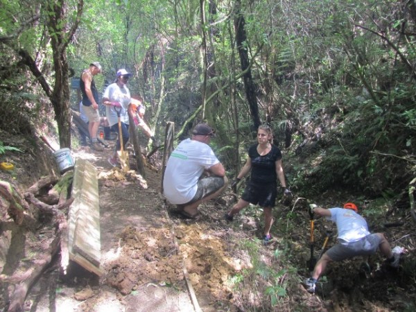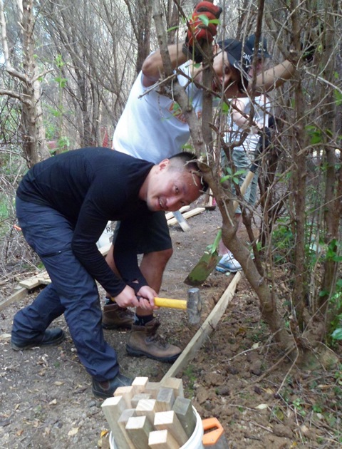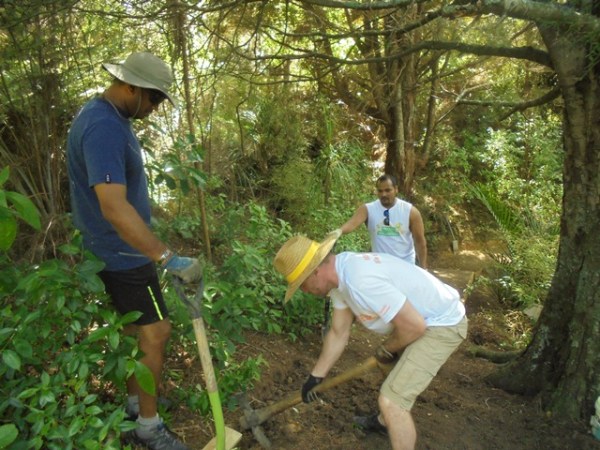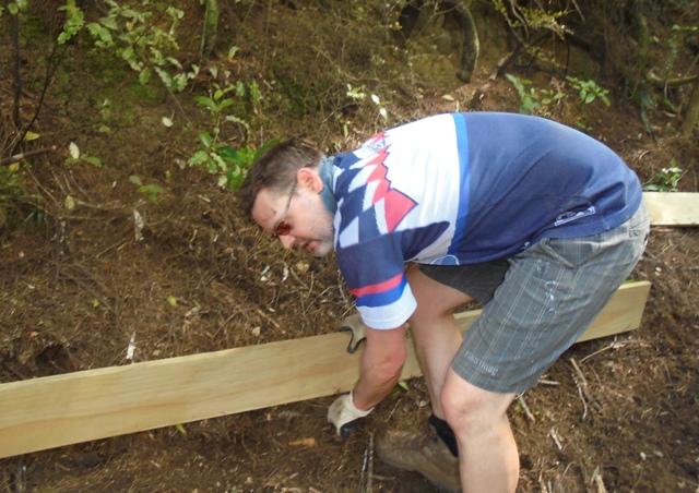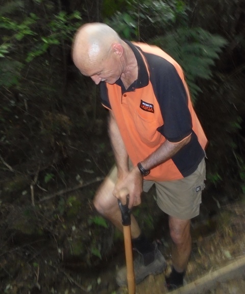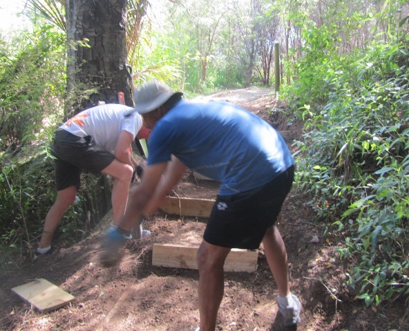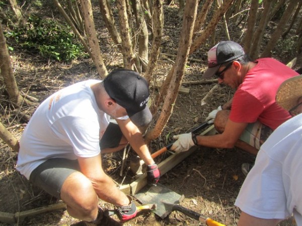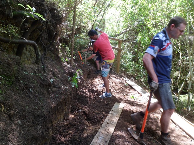 This walking track starts at one of the maintenance roads and was the first track developed in 2012. Over the years as the trees have grown up it’s gotten harder to see the track. The task for this team was to reorient the track through the bush and install side boards to clearly define the track edges to make it easier for visitors to stay on the track. The first task was to measure and dig out channels for the boards.