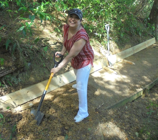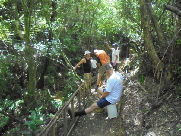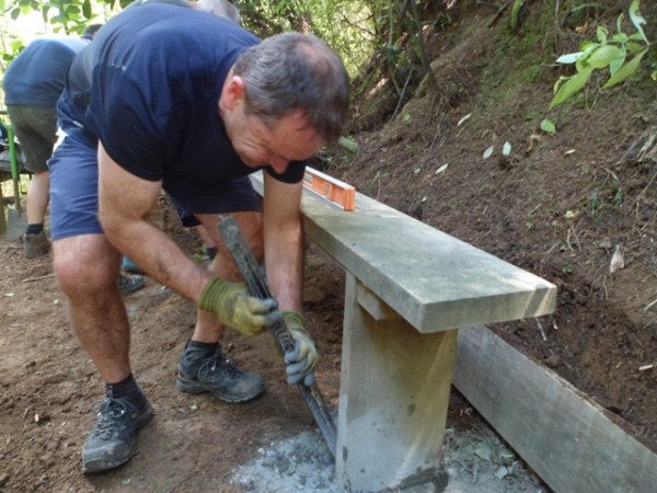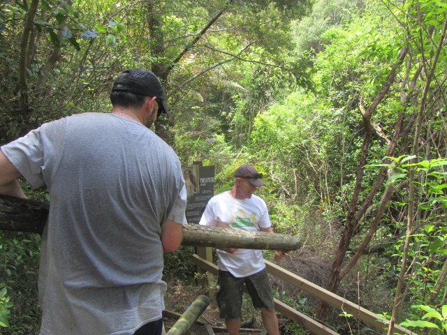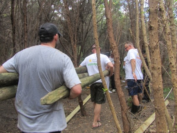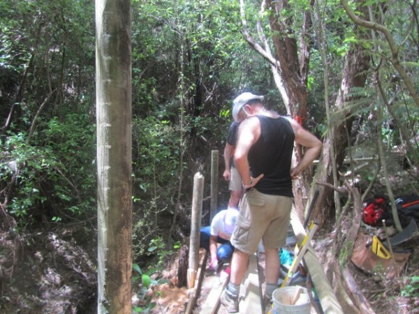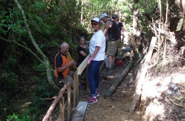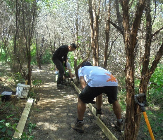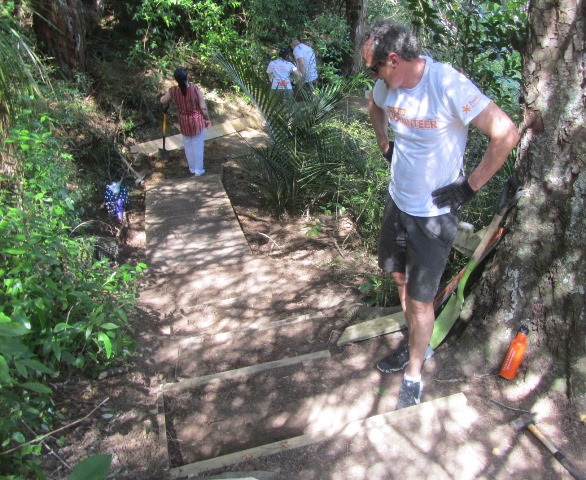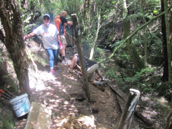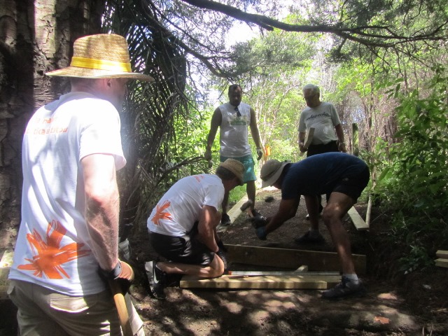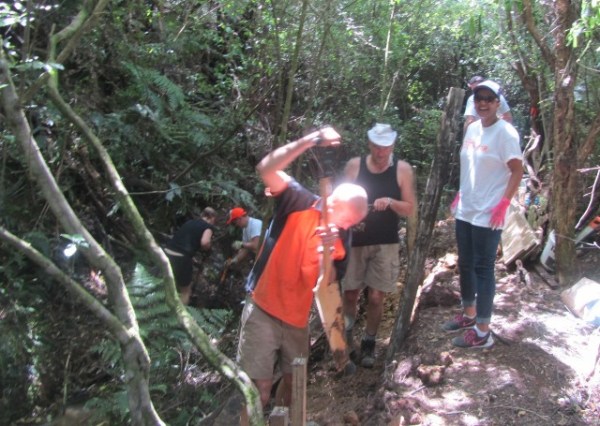 A section of the walking track runs along the CUE Haven stream and over the years there has been some erosion. We have begun to improve the track by widening it and installing a handrail. One team tackled the project of further widening the track and finishing off the railing section.