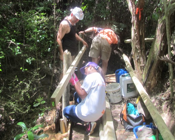 They studied the area where the railing would be installed and first had to clear out a lot of old dead vegetation to see where best to put the railing posts.
