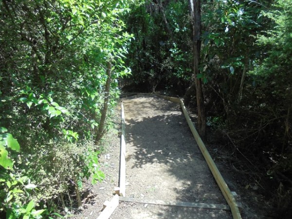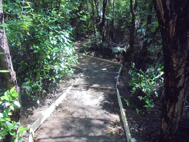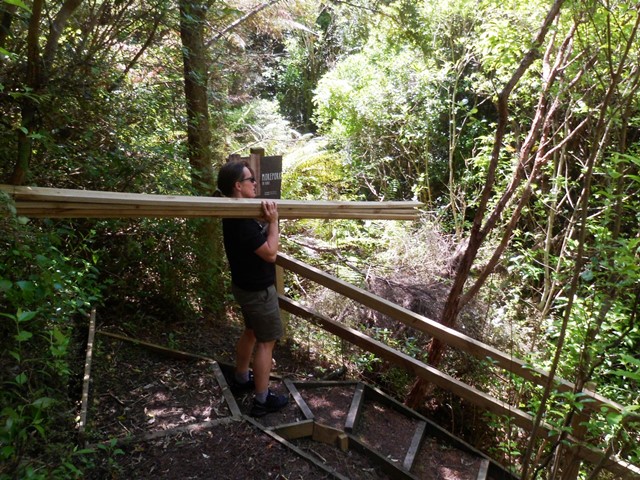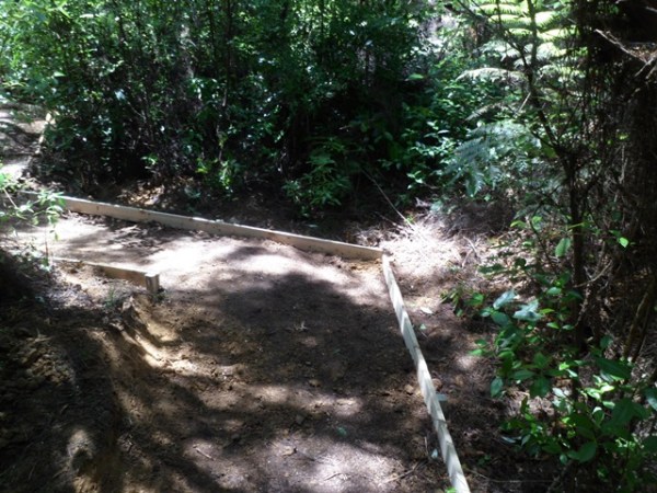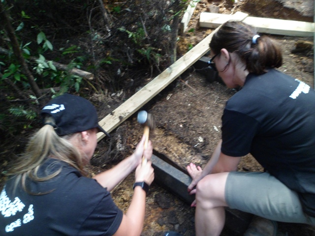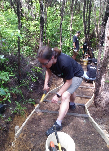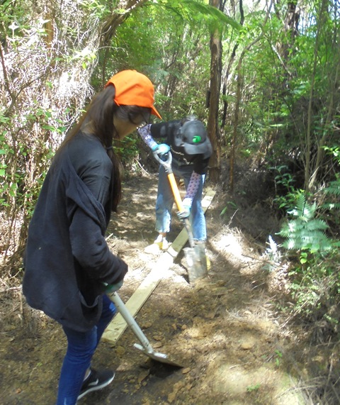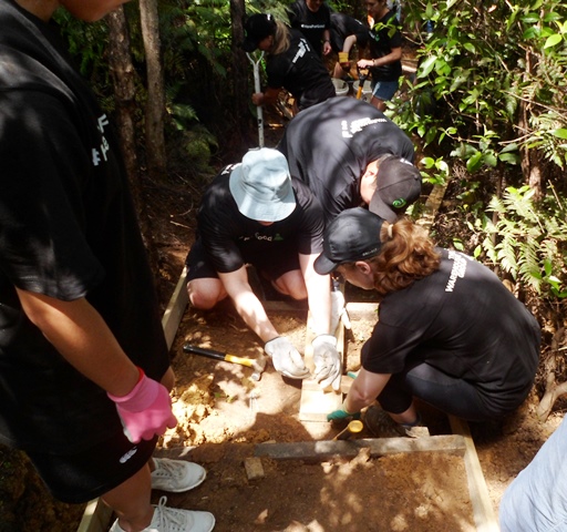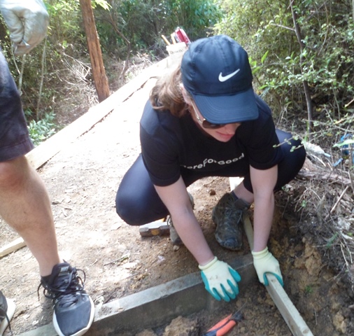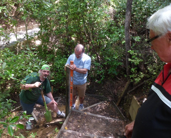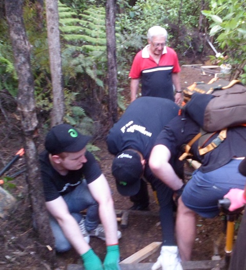 While part of the group worked on widening and lining the track, part tackled several sections of steps on the track. Several of them were uneven and out of line and the group decided to fix them before putting on side boards.