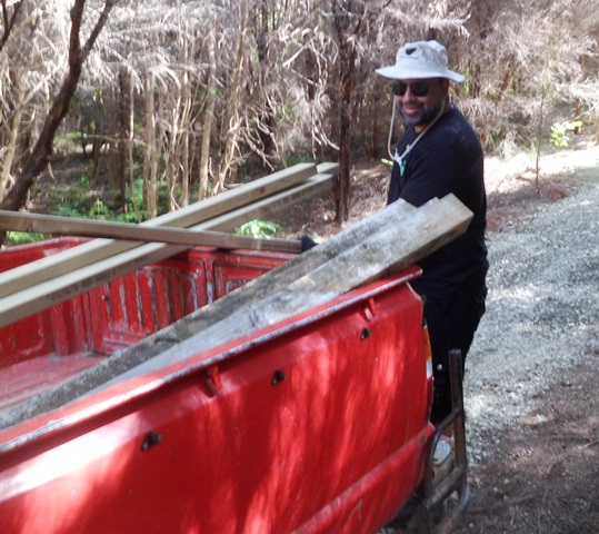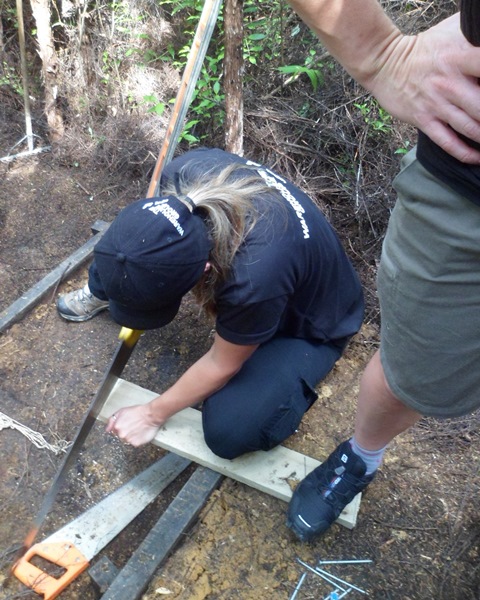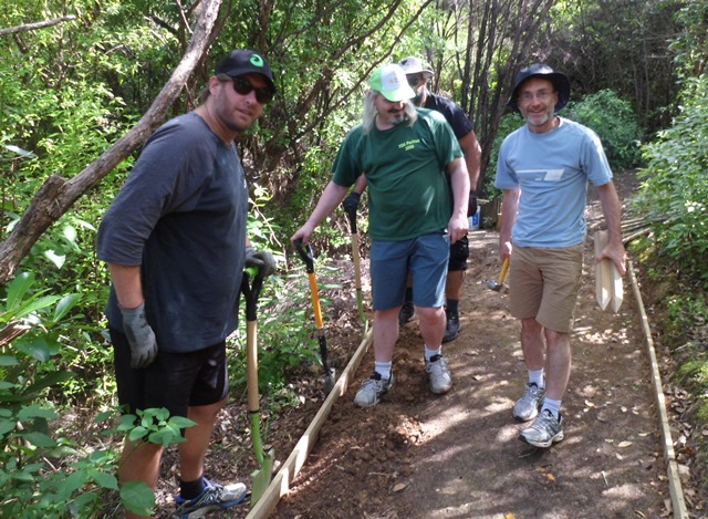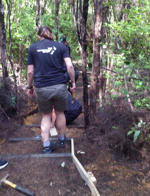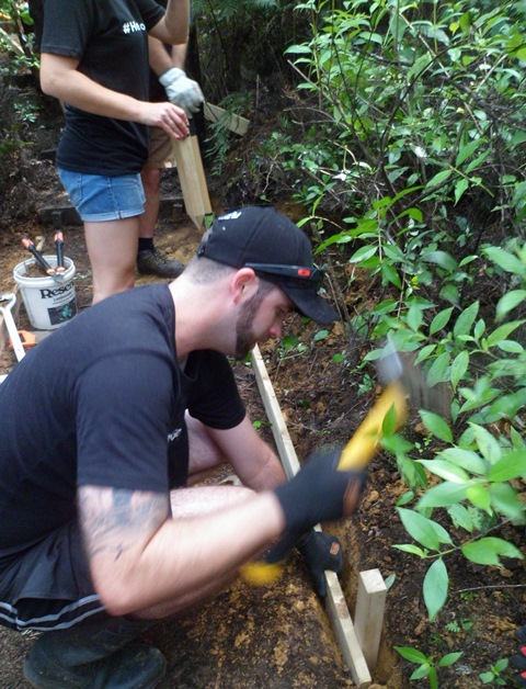 The long section of track needed side boards to protect against erosion. There were also some steps that were not well aligned. Because we were working in a small area, people moved around between teams to help out with different tasks.