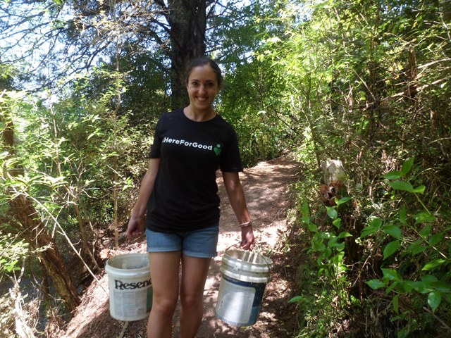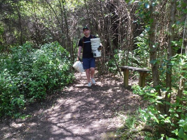 We drove the full buckets as close to the track as we could and the group carried them down to the site.