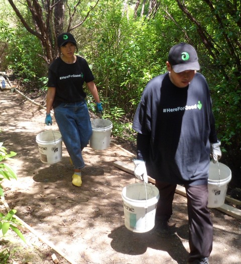 The third team worked to install railings on some steps leading down to another track by the CUE Haven stream. It was a challenging job because the steps go around a curve.
