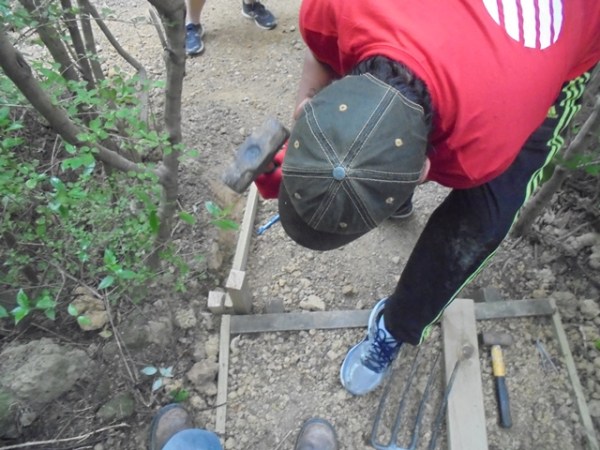 The other team worked on a section of track a little further down. Their challenge was to determine the best way to incorporate an existing bench into the track. They laid out a plan for where they would place the side boards.