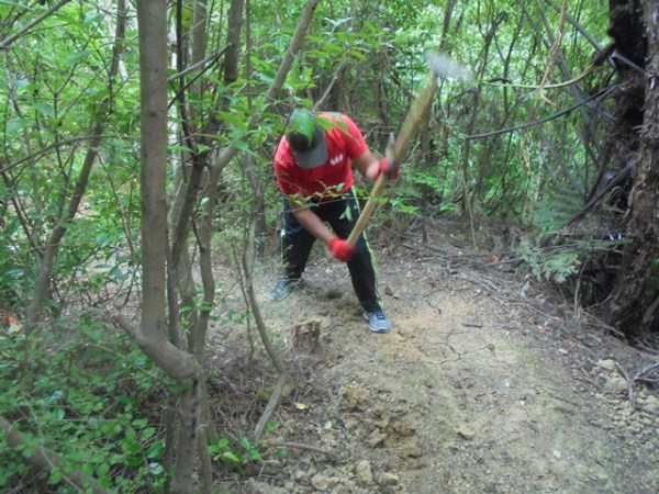 One team tackled a steep bend in the track that needed side boards to protect against erosion. The situation was complicated by a dead tree stump that created the need for a sharp bend in the track. Before they could determine whether they needed to install steps, they decided that removing the stump would enable a more direct route.