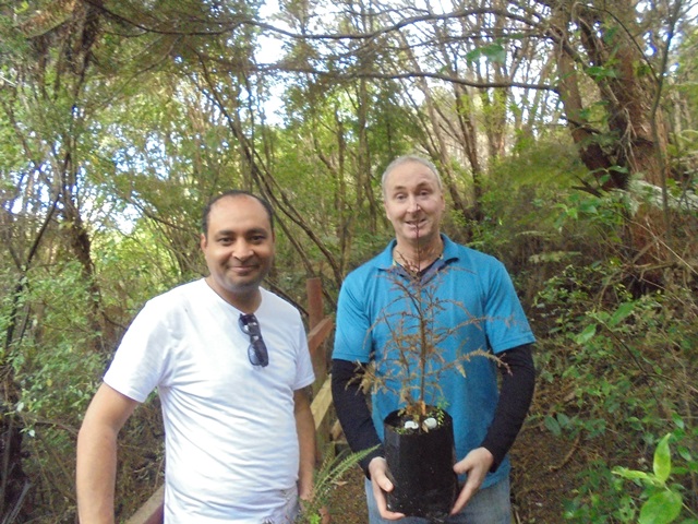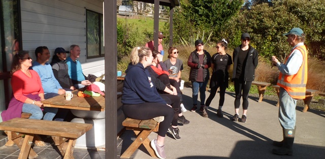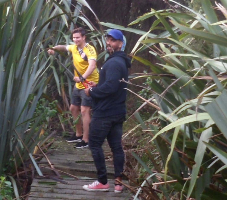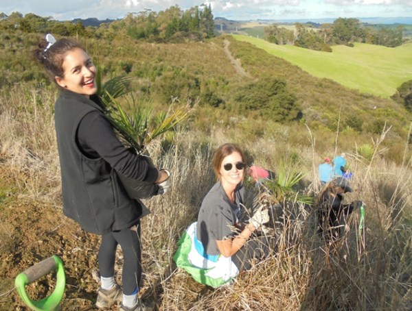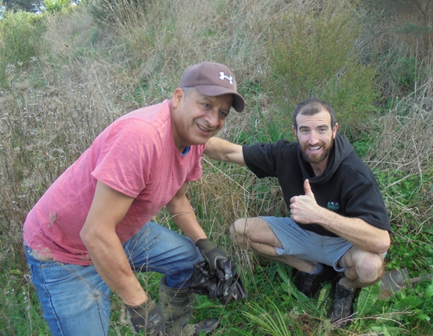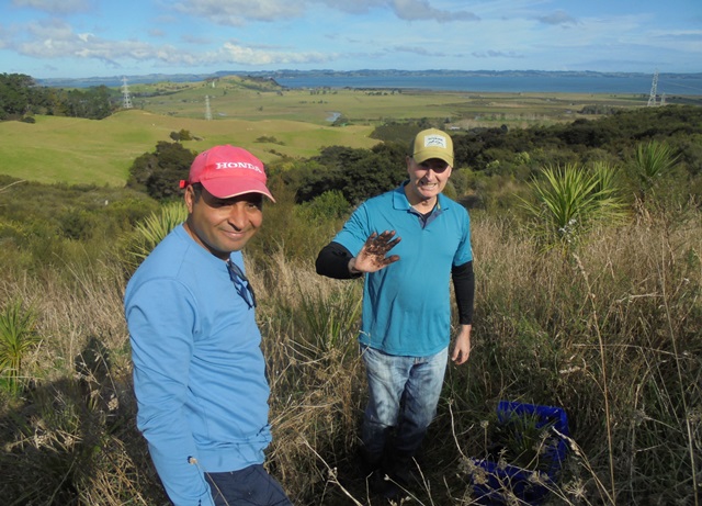 We aren’t doing much planting this year because it has been challenging to rebook volunteer groups who were scheduled to come during the lockdown. Today we just planted a small number of specialized trees–nikau, puriri, totara, miro and ferns in several different parts of the property. As a result, the group moved around over the course of the day with people leaving and joining depending on their schedules.
