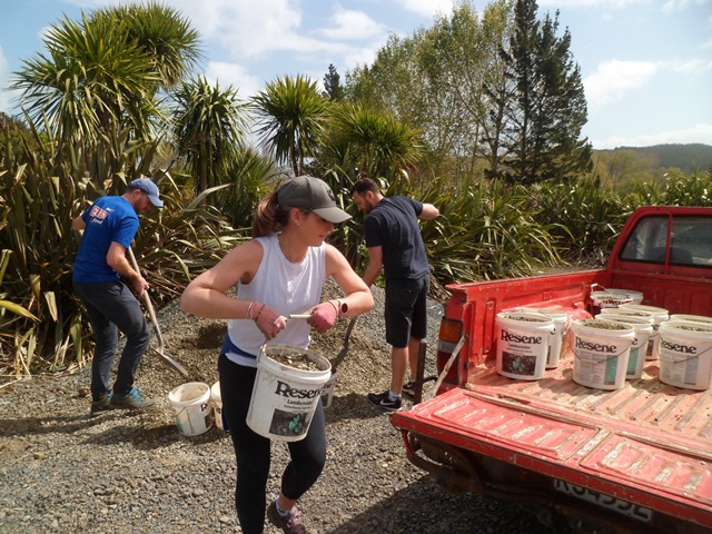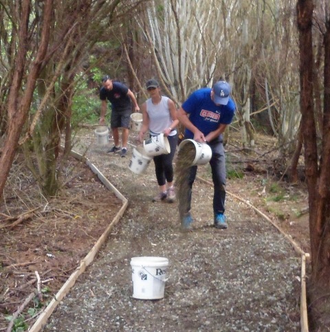 The team wanted to completely finish off their section of track by laying down a layer of gravel to make the track fit for all weather use. Part of the team went down to fill up buckets with gravel.