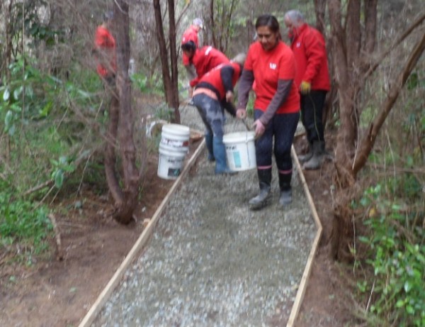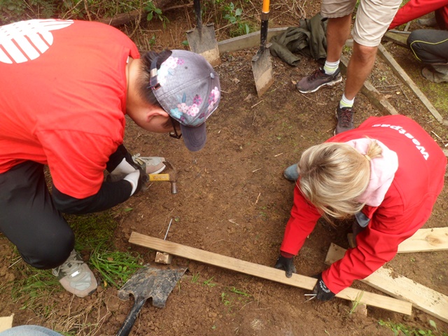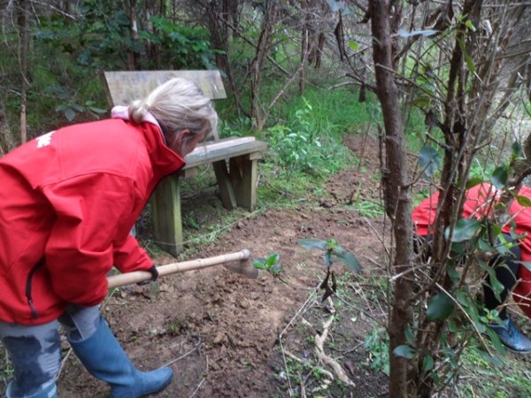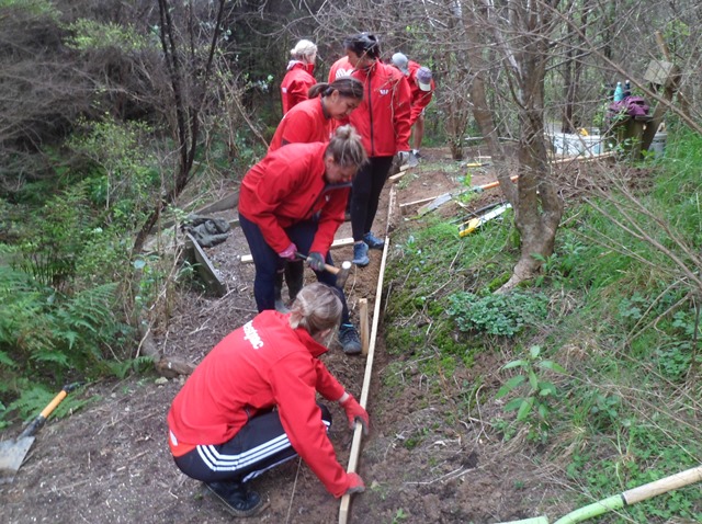While the first team worked on their section of track, the second team did some work to improve access to a bench along the track. The bench was slightly elevated, so the team had to plan the best way for visitors to access it.