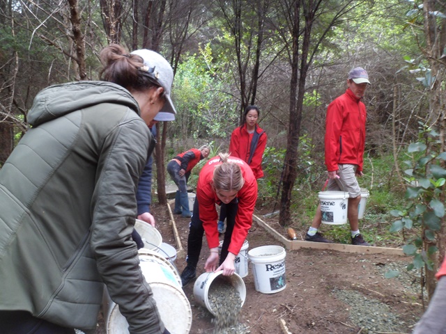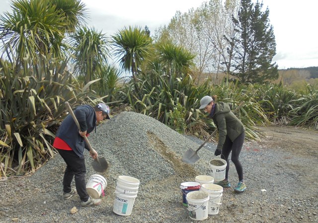 The hardworking and enthusiastic team were determined to complete their track upgrade and so we went down to the gravel pile in the car park and filled buckets to spread on the areas of the track they had remediated.