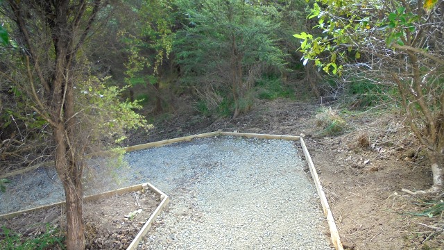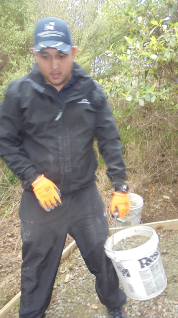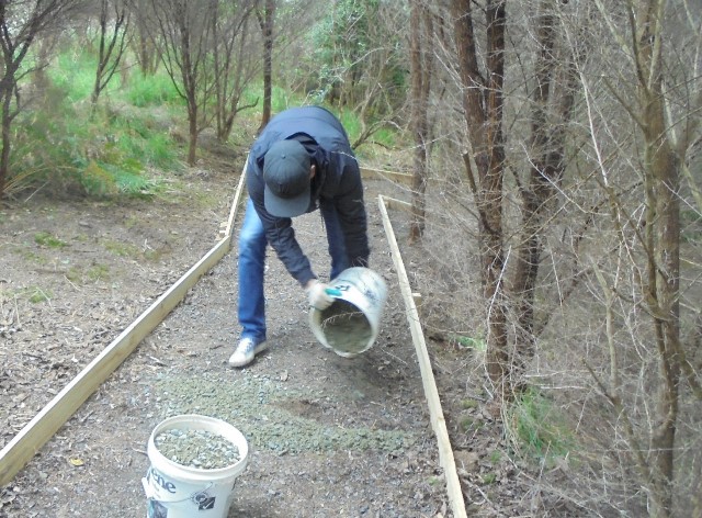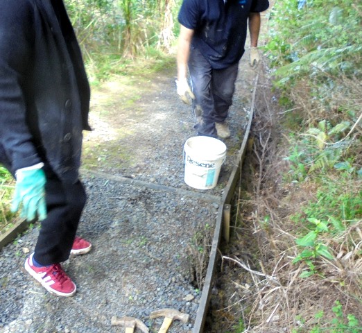The group finished off the day by laying down a layer of gravel on the new section of track they had completed. We loaded up buckets full of gravel down in the car park.