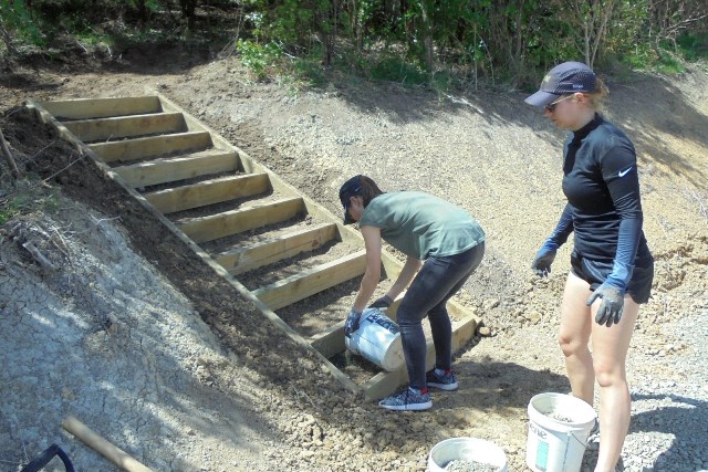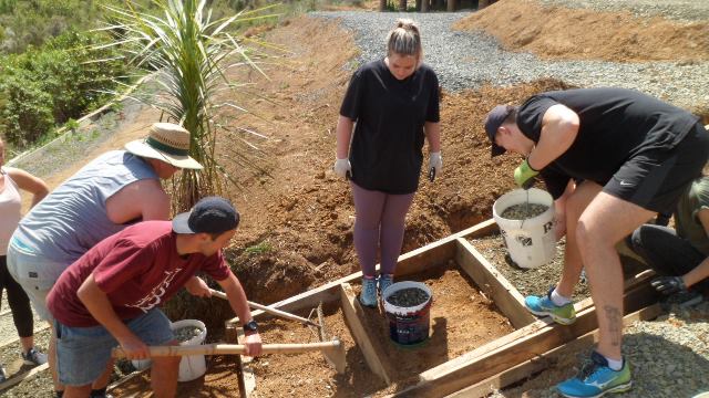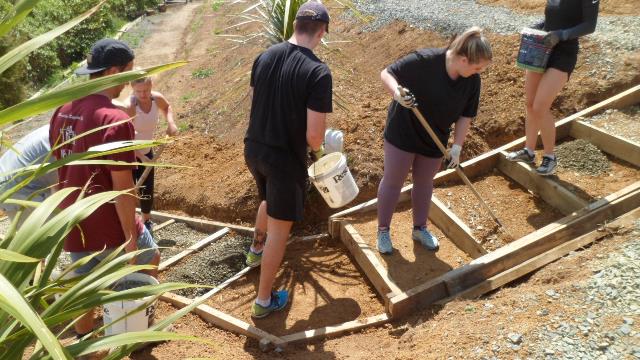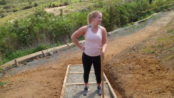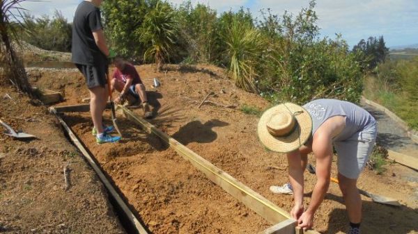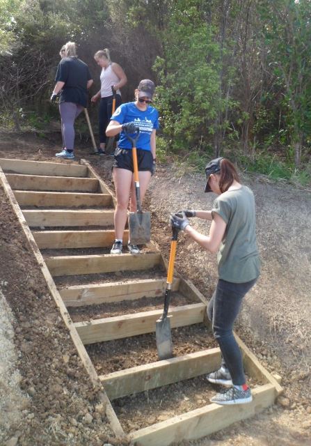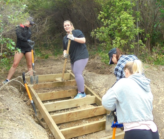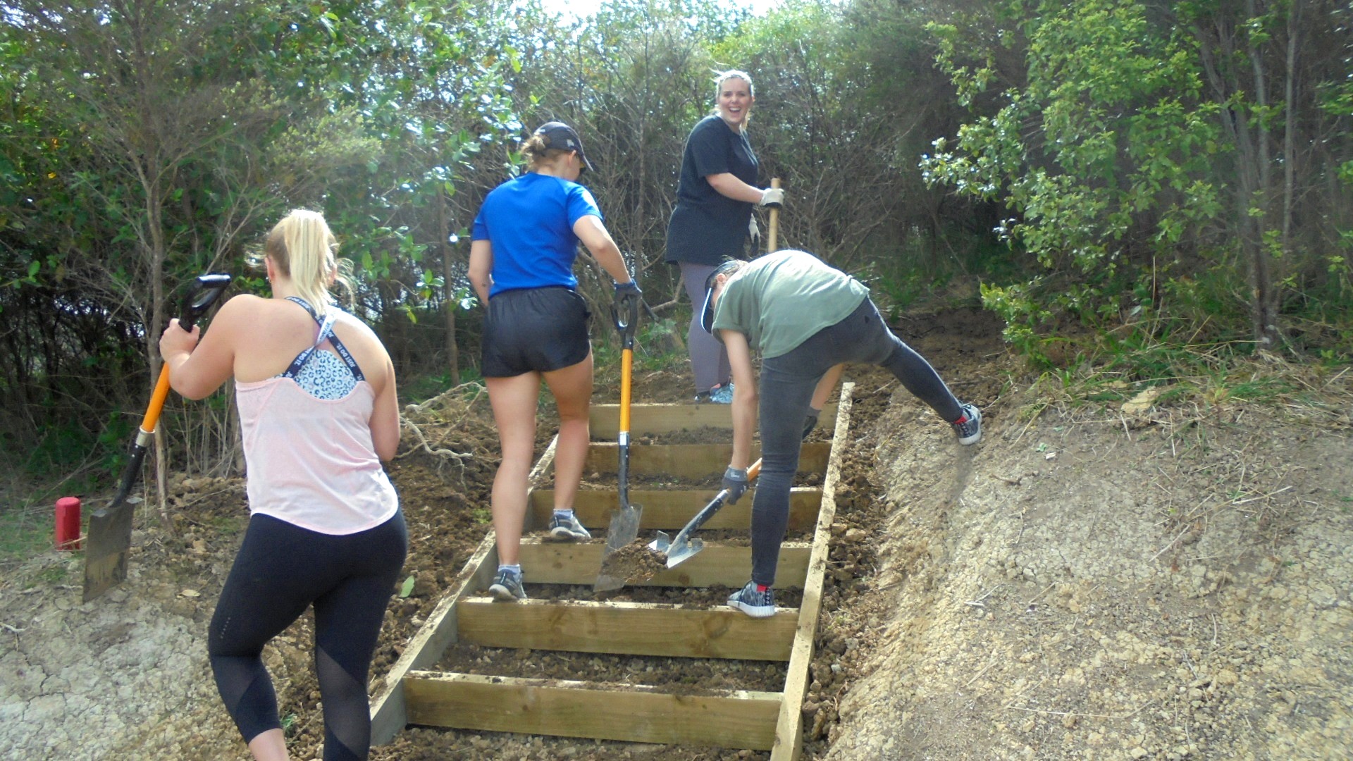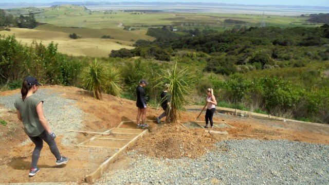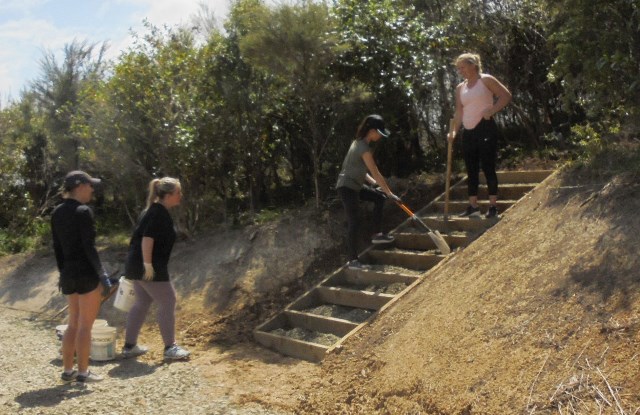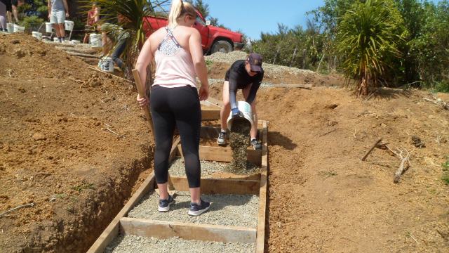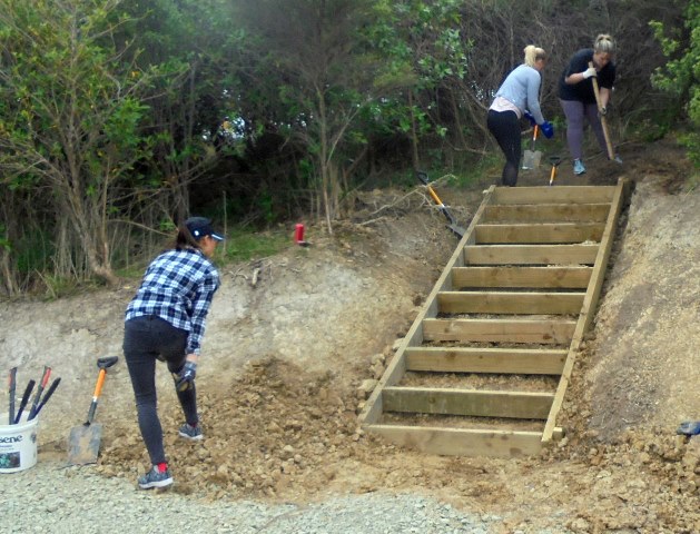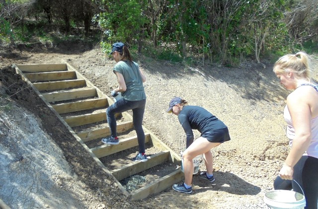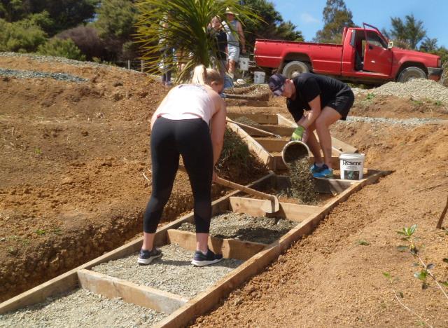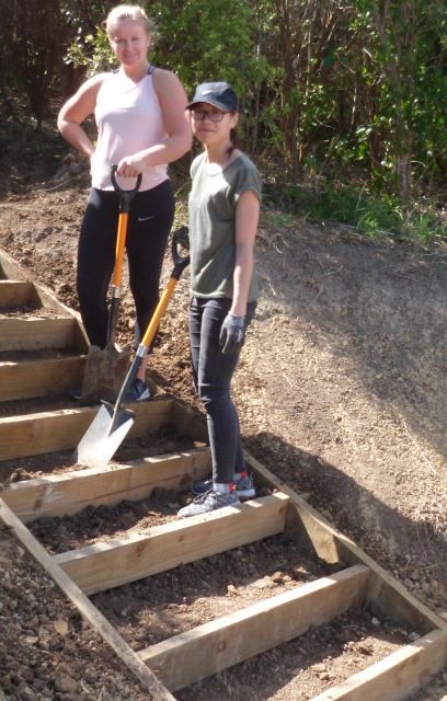 One team comprising Ida, Kelsey, Phoebe and Rebekah worked to finish off a set of steps up to a lookout area. The steps had been boxed in but now needed to be filled in and levelled.