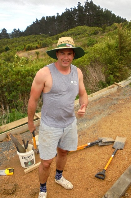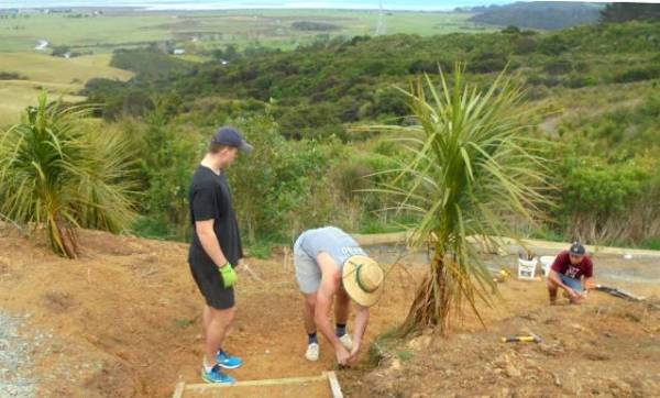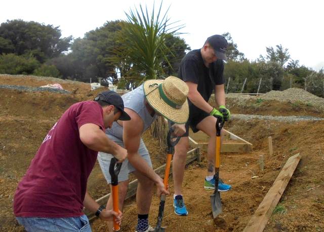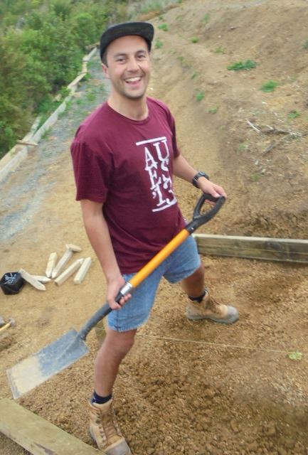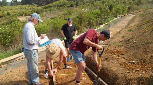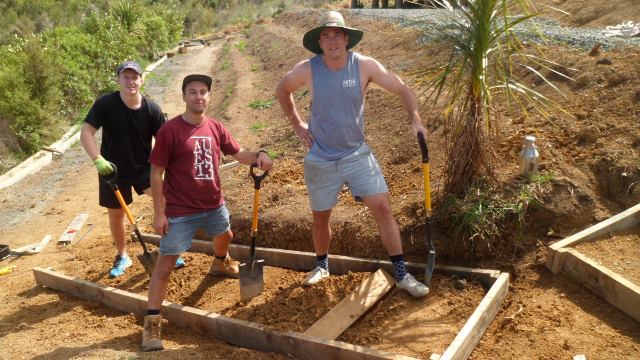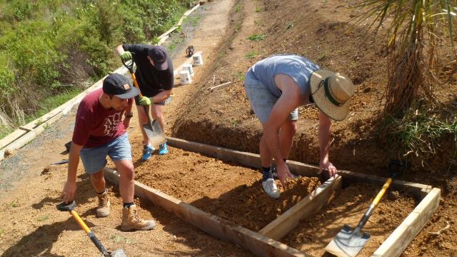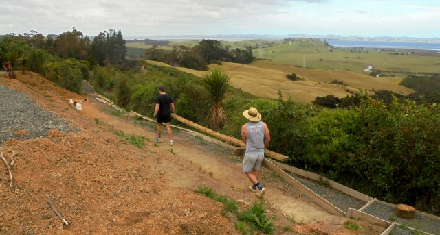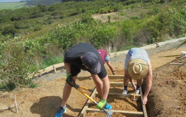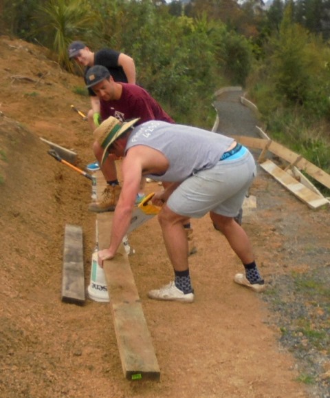 While the steps were being finished, the second team of Felix, Kurt and Simon went to work finishing off a track section connecting the main walking track with the viewing platform area. A previous team had started the steps, and to finish them off we needed to continue to dig out and box in steps down to the main walking track.