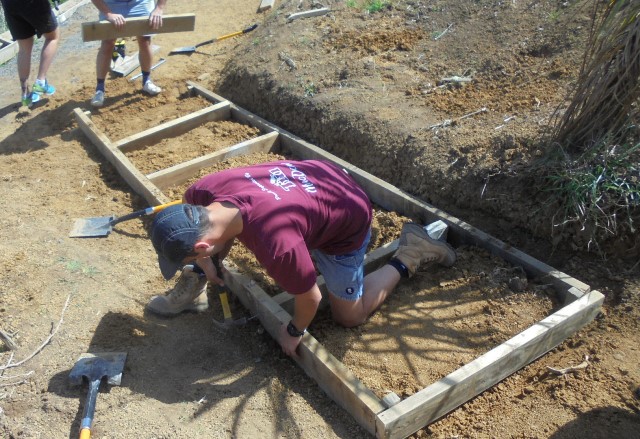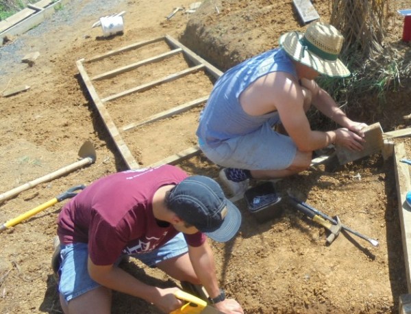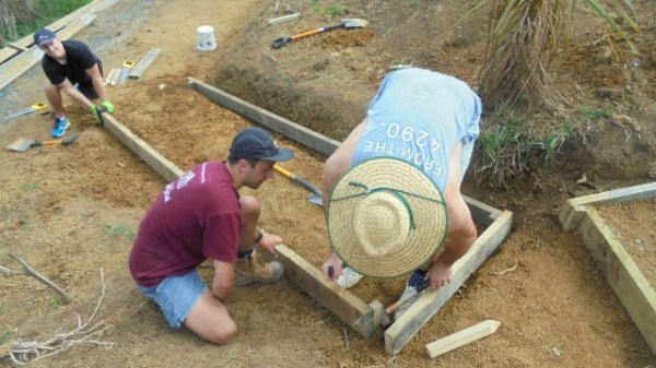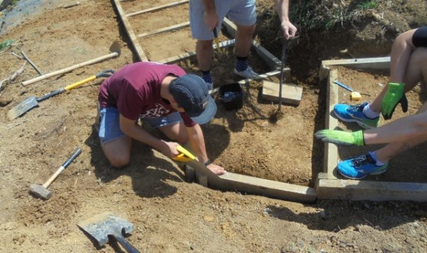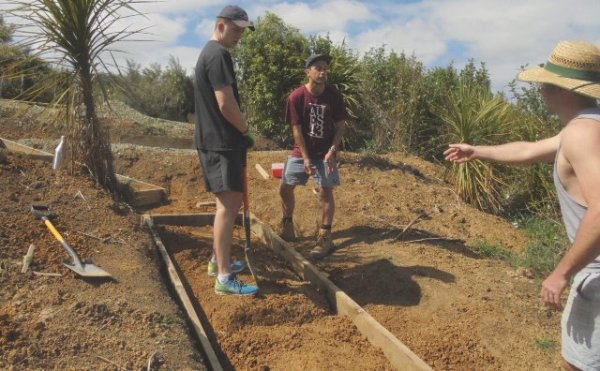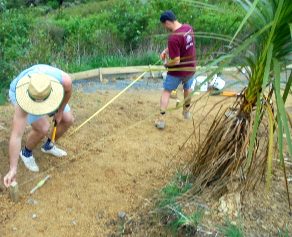 They took some time to study the area and develop an approach and once they decided on the layout of the section, they marked it out with pegs and string. They measured to determine the length of the side boards.