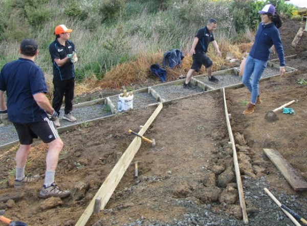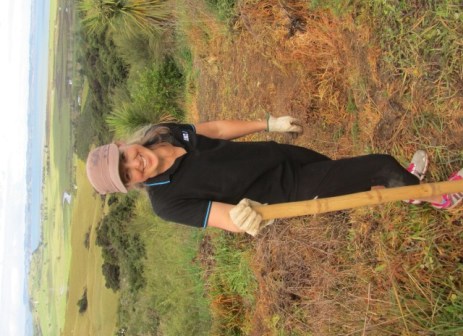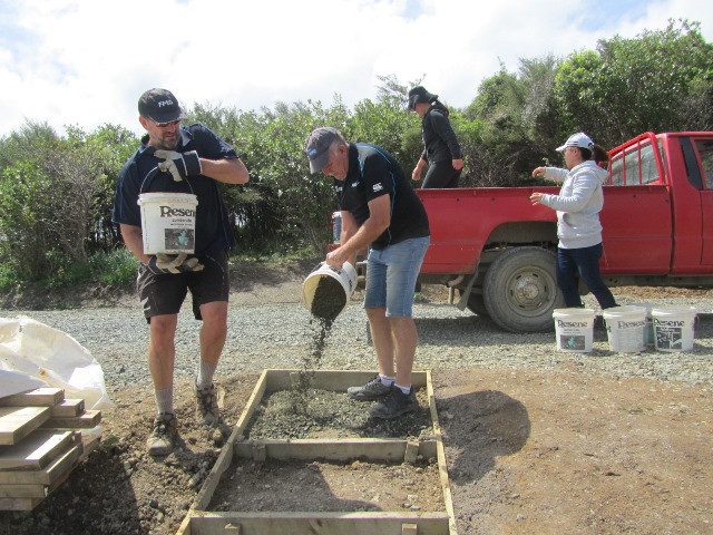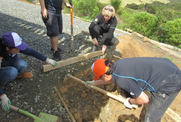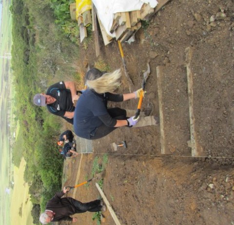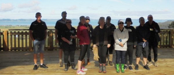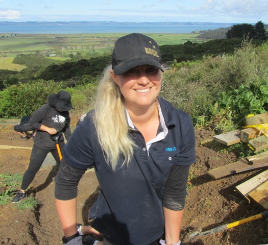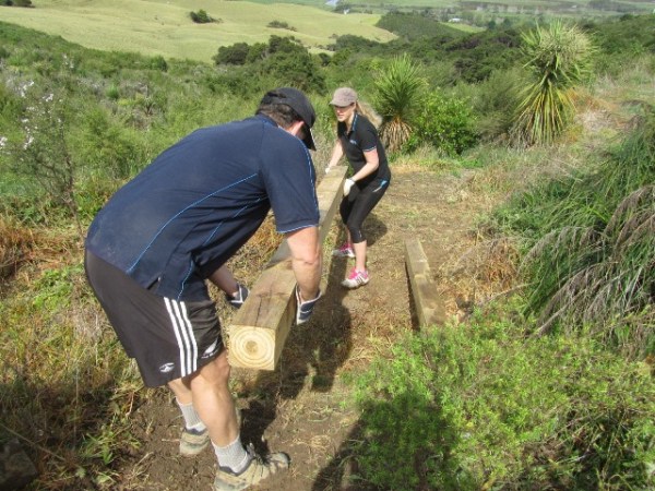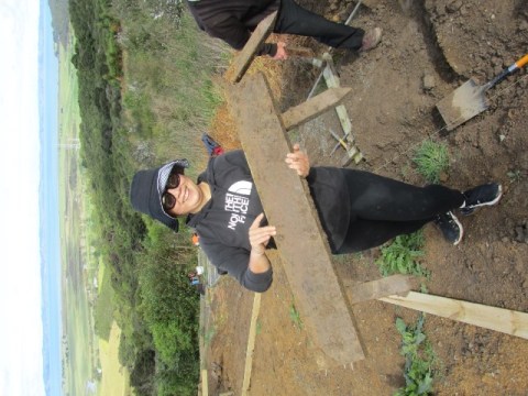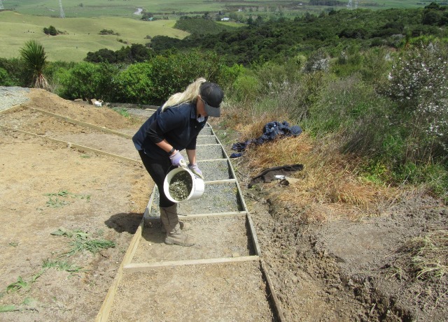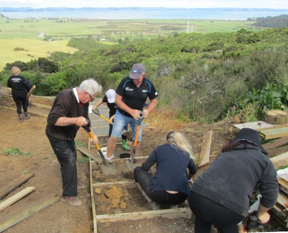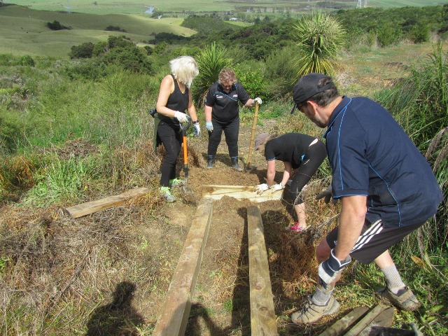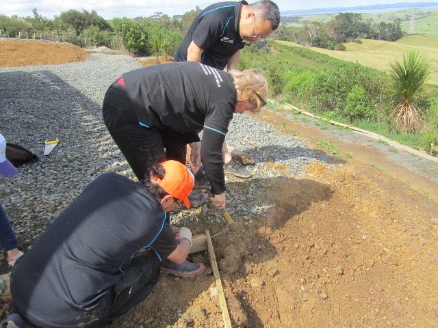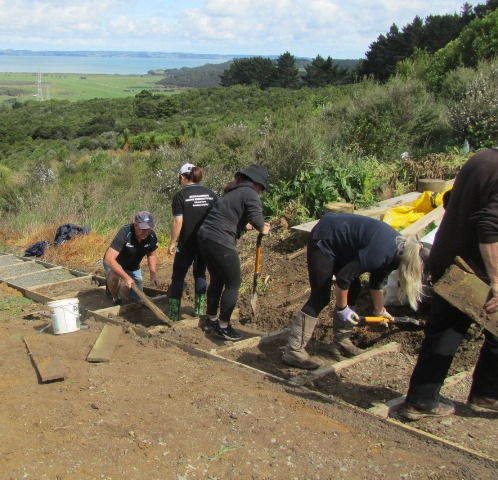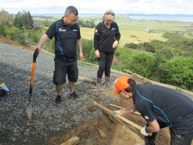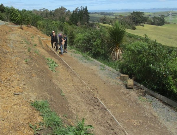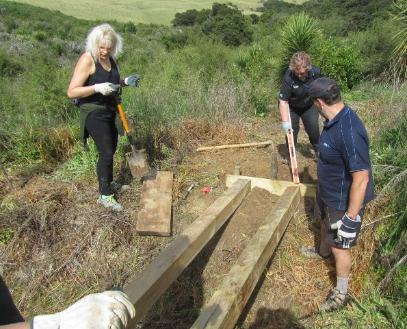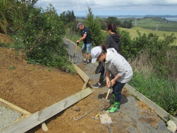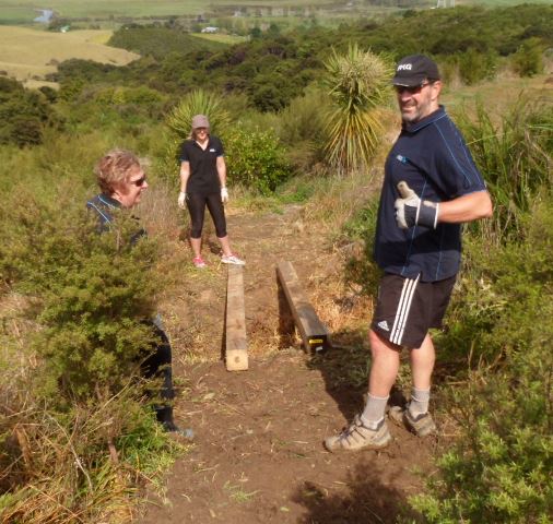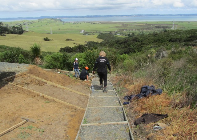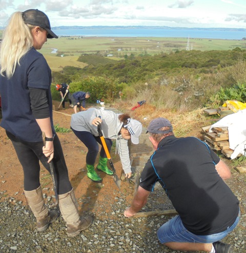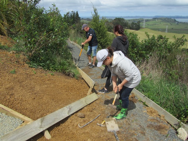 The plan for the day was to continue to work on fixing up the walking track approaches to the viewing platform area. We drove up to the site and went to work. Once on site, Thomas showed the group the work to be done and they then split into three teams to tackle the separate projects. One team worked to repair a section of walking track that had been damaged during the platform construction, another team built a short track from the main walking track to what will be a seating area around the platform and the third team built a track connecting the main walking track to another section of track. This new track will allow visitors more direct access to the platform area.