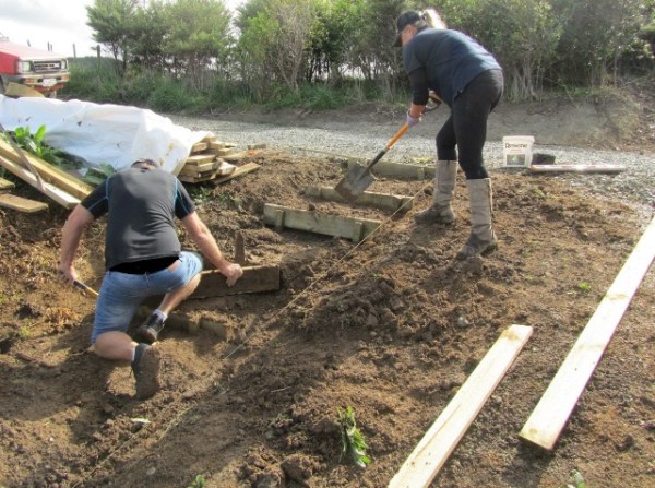 The first task was to determine the best placement for the track, taking into consideration the slope and terrain. Once they determined the best route, they went to work digging out channels for the side boards.