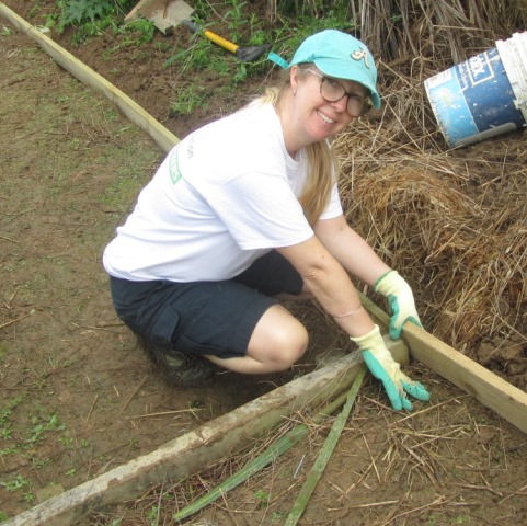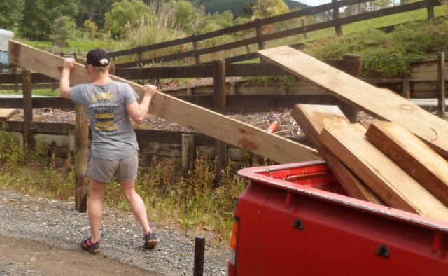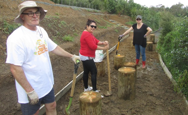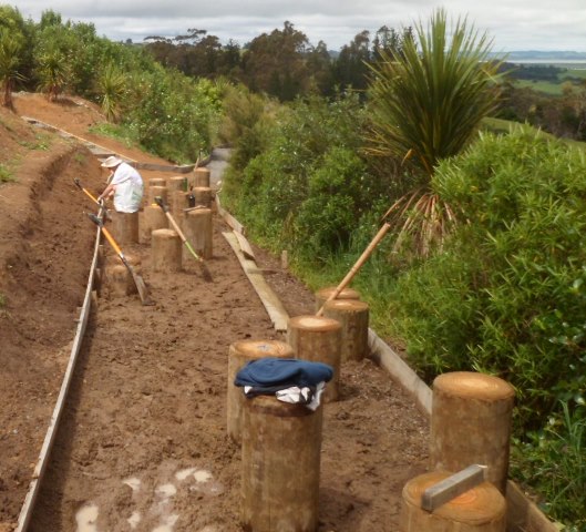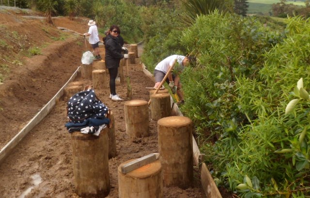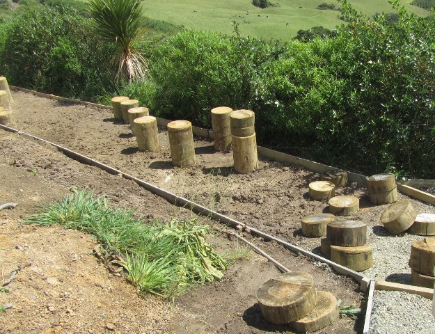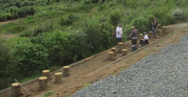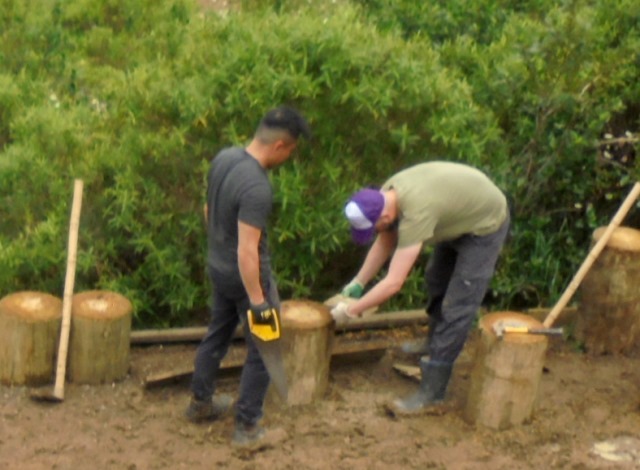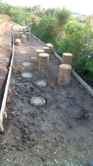After lunch, things had dried out a bit and the team had the innovative idea of using some of the smaller pole offcuts as stepping stones around the stools. They dug out holes and places the sections along the track.