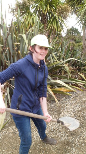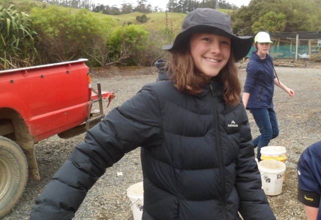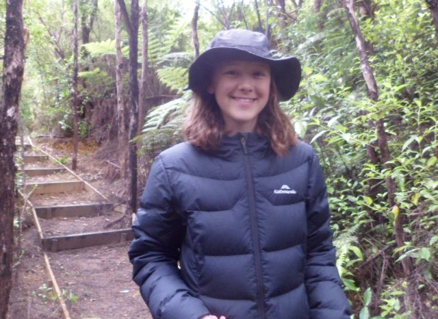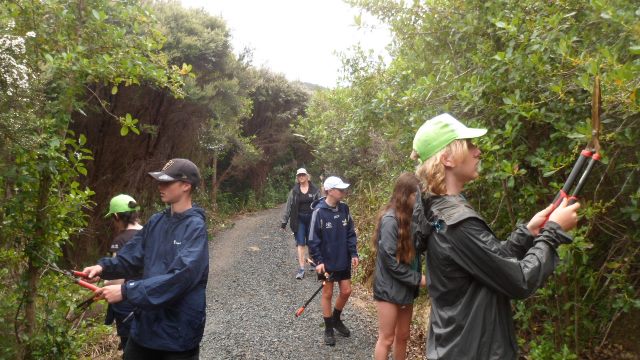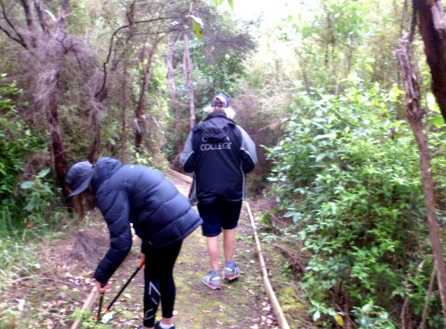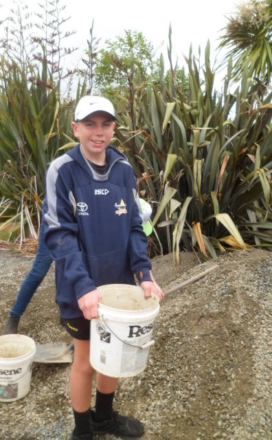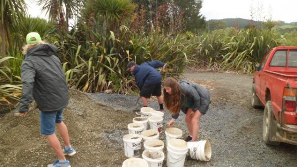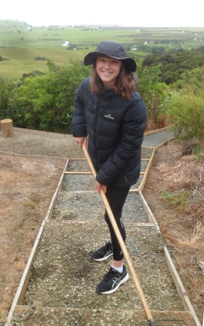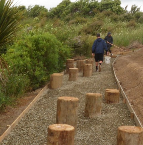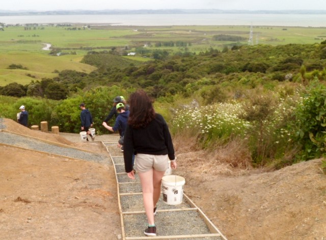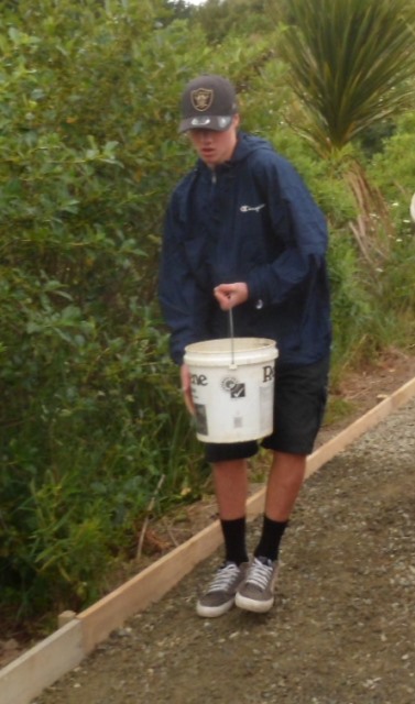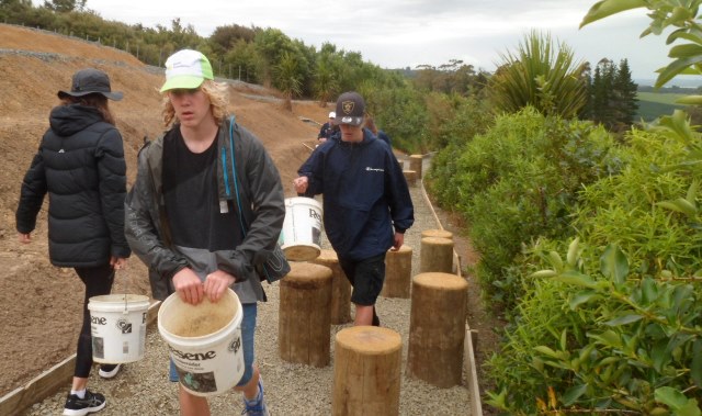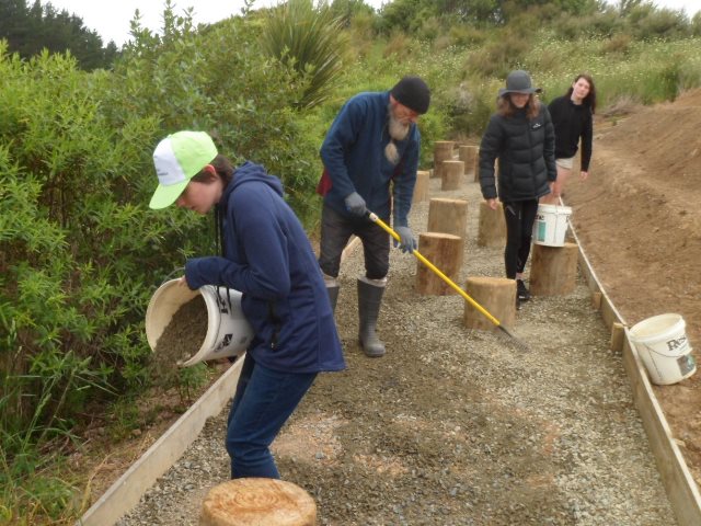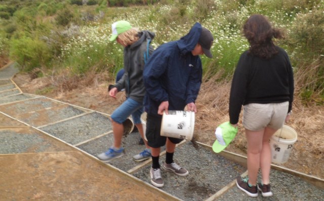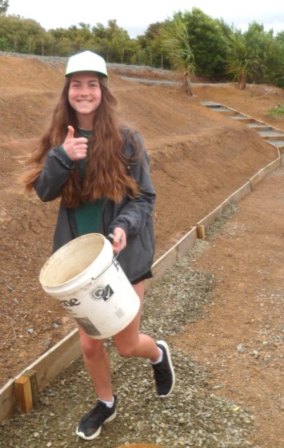 We first asked the students to help us finish off a section of walking track near the viewing platform that we have been working on. Our friend and neighbour Lyall has made some seating out of the offcuts of the viewing platform foundation poles and improved and widened the track. The last step was to finish putting down a layer of gravel to make the track easy to use in all weather.