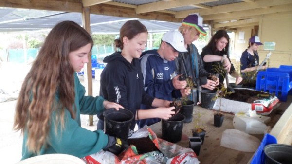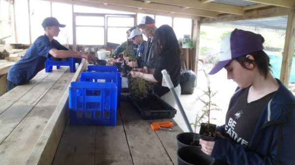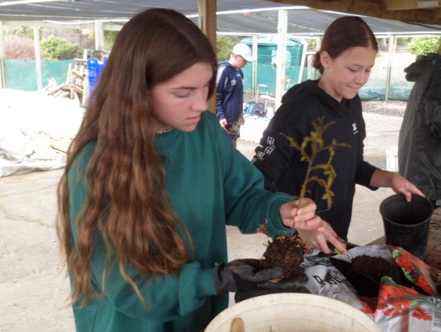 After lunch, the students helped out with one last task. Last year, we had rescued some kahikatea seedlings that had self-seeded and were growing on one of the walking tracks. The small seedlings now needed to be transplanted into larger pots. Thomas gave a quick potting demo and then working in teams, the students quickly potted up the seedlings.