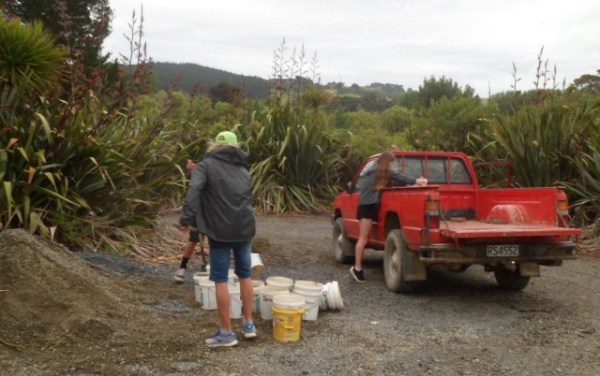 We drove up to the end of the track to unload the buckets. The buckets were dumped on the track and Lyall was on site and helped out by raking the gravel smooth and making sure everything was level.