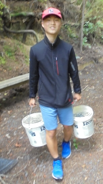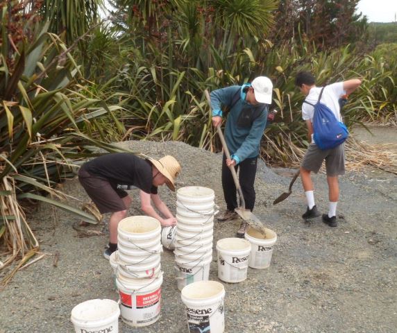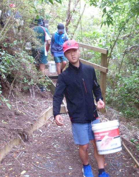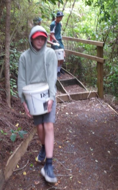 Once the trimming was finished, we asked the group to put a layer of gravel on a section of track we have been improving. The boys filled up buckets of gravel and Thomas drove them as close to the track site as possible.