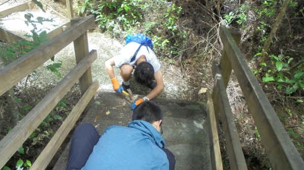 While doing the gravelling work, the group had to cross a bridge where a section of the wire mesh installed to improve traction had worn away and they took on the task of cutting and installing a new section of mesh.