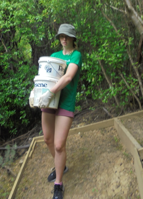 Once the trimming was finished, the team helped with putting a layer of gravel on a section of track we have been improving. We filled buckets with gravel and Thomas drove them as close to the track site as possible.